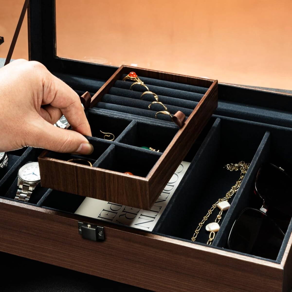 ◆時計4本の収納に加え、ネックレス・ピアス・指輪などのジュエリー収納にも対応した万能設計です。