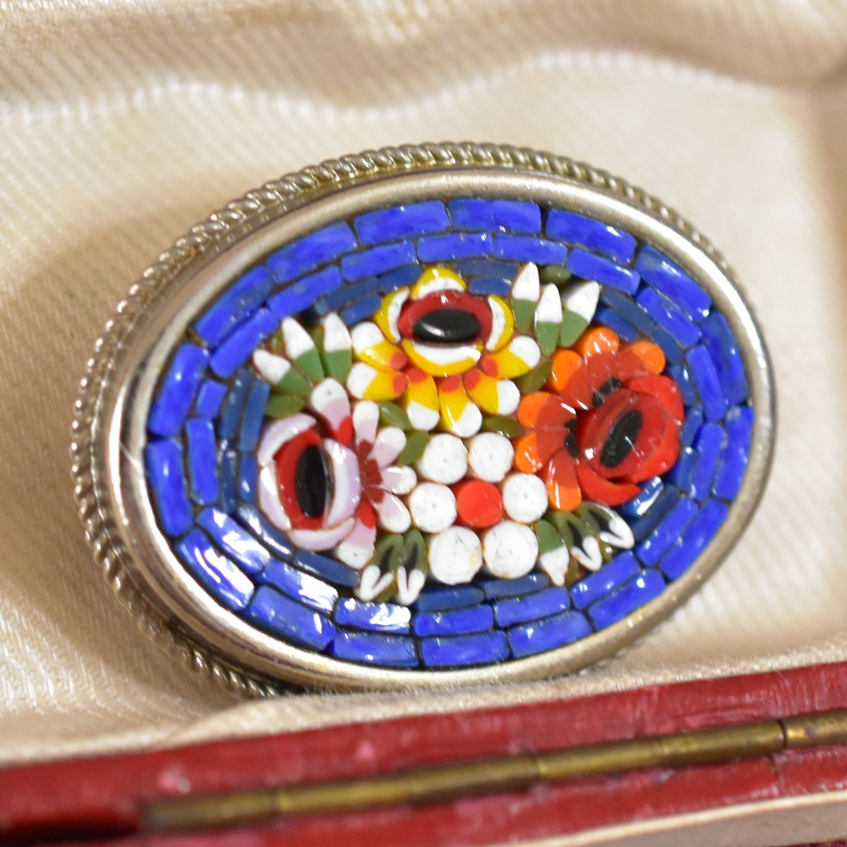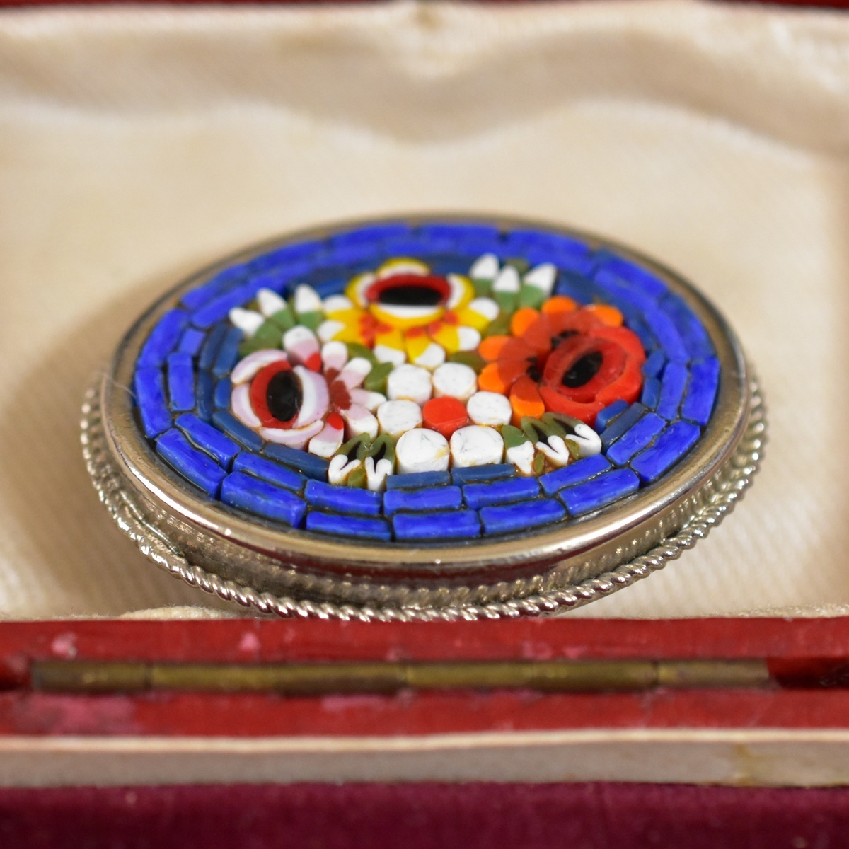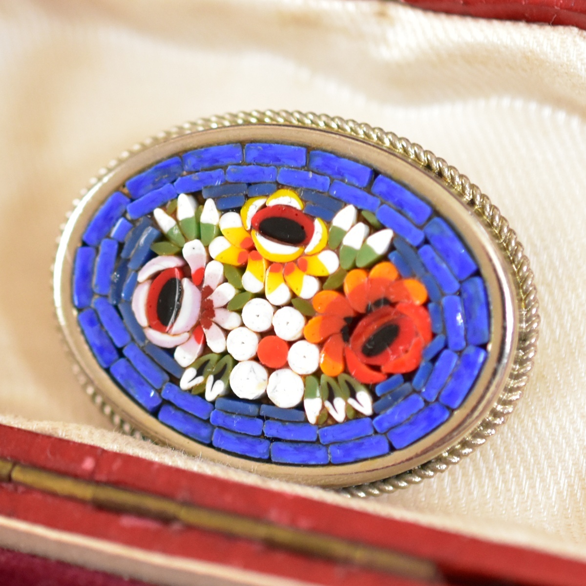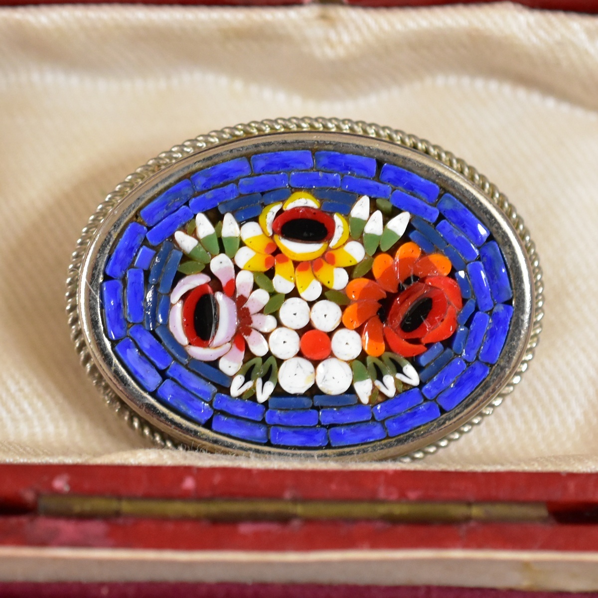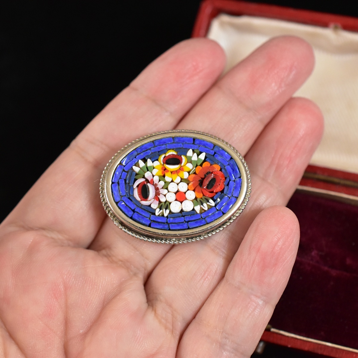 イタリア製ヴィンテージ ラピスラズリのようなブルーのマイクロモザイク、花束のブローチ 本物保証 ※針なし※