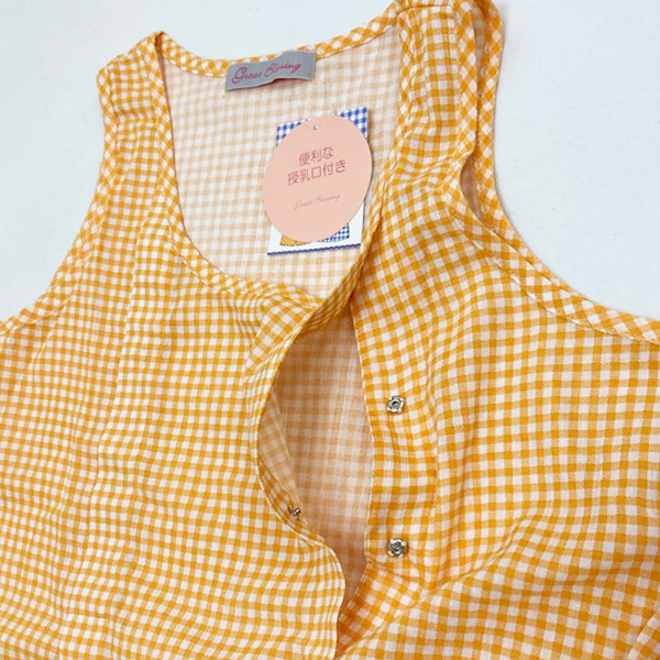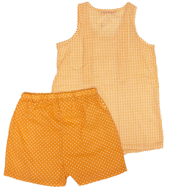 タンクトップはチェック柄、パンツはドット柄のセットです。