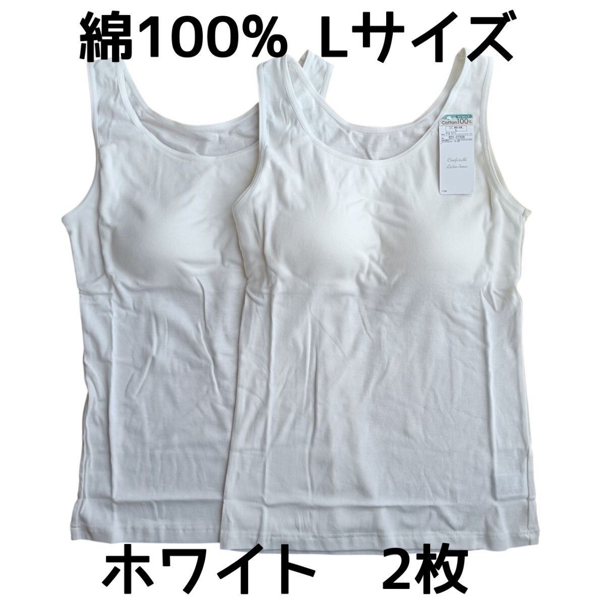 ホワイト Lサイズ2枚 取り外し可能丸パット付きタンクトップ 綿100% インナー ルームウェア コットン100% 白