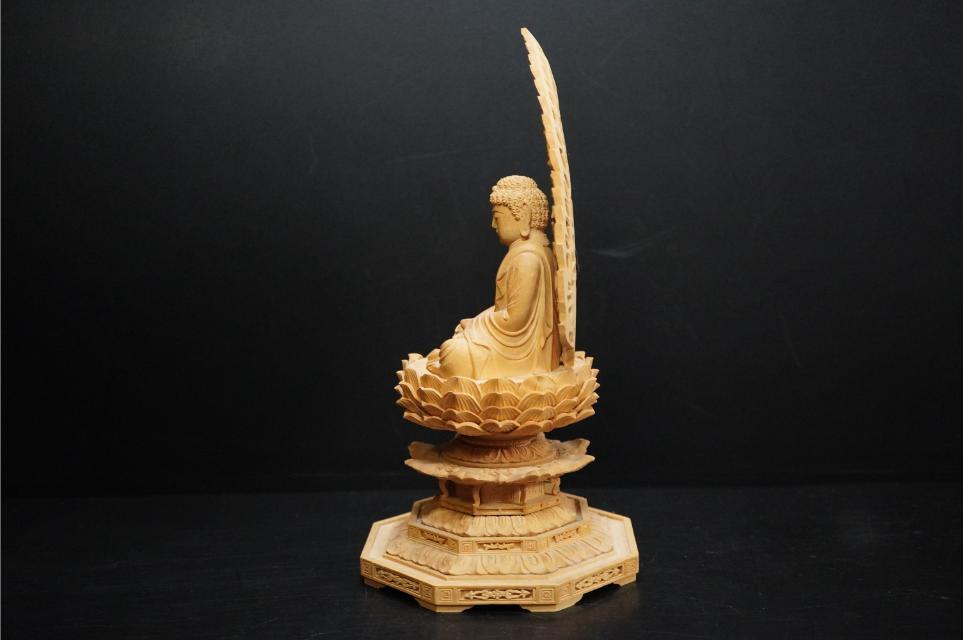 仏像 木彫 白木 細密彫刻 [阿弥陀如来像] 飛天光背 全高25.5cm 仏具です。