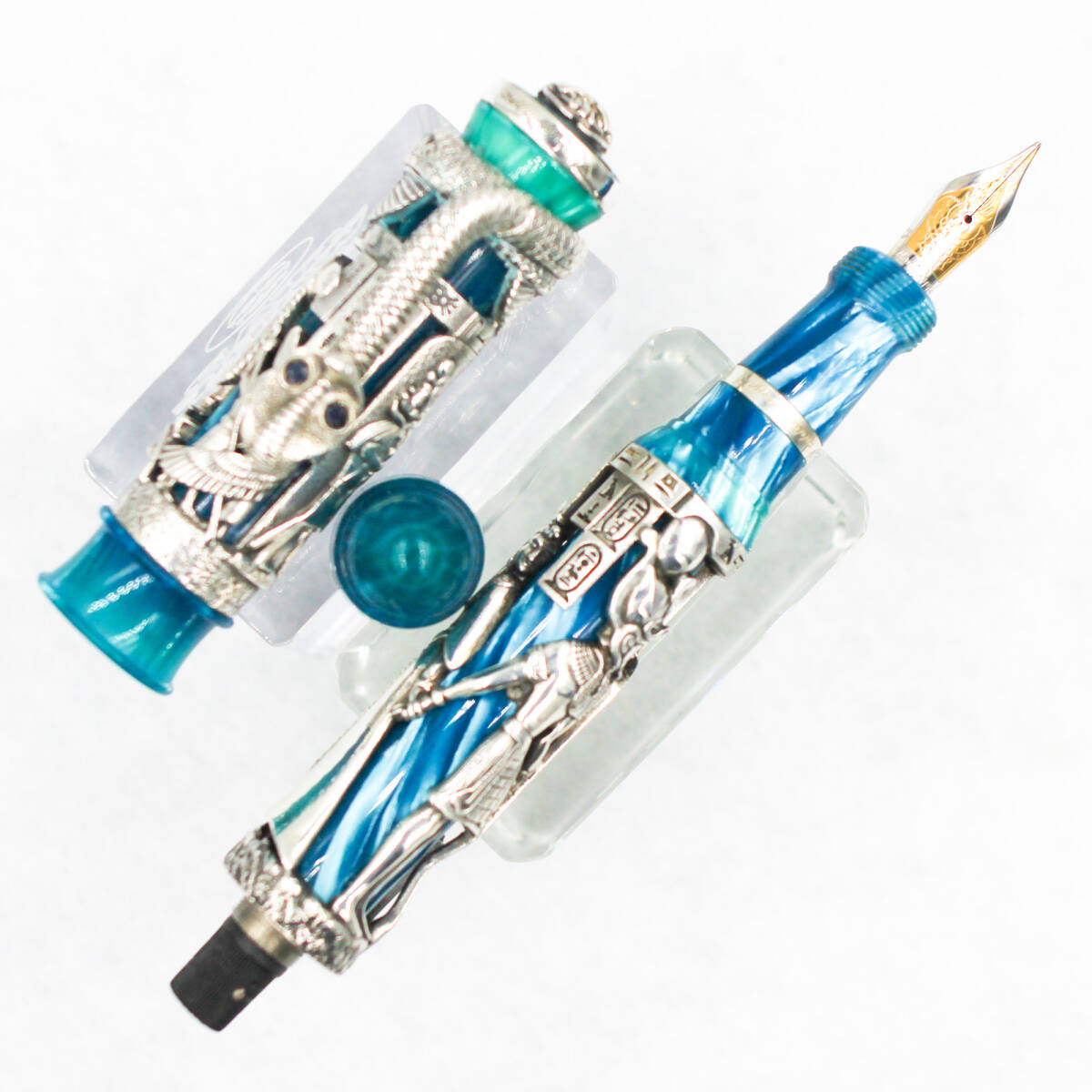 ○ バレルにはファラオと王妃、それに知恵、知識、書記、文字、科学、魔法、芸術などを司る朱鷺の頭を持つトト神が、キャップの中央で一際目に付くクリップは、悪を退散させる女神ウァジェトの化身であるコブラが鎌首を擡げた姿を立体的に作り込まれ、その目にはサファイアが嵌め込まれています。キャップの他の部分にはイビス神やホルス神が、また天冠にはエジプトの守り神であるスカラベが極めて立体的に作られ、その眼にはやはりサファイアが嵌められています。またニブには、ホルス神が格調高く刻まれています。更にエジプトの文字であるヒエログリフも精緻に彫り込まれているため、古代エジプトについて調べながら何が作り込まれているのかを知っていくのも楽しい万年筆です。