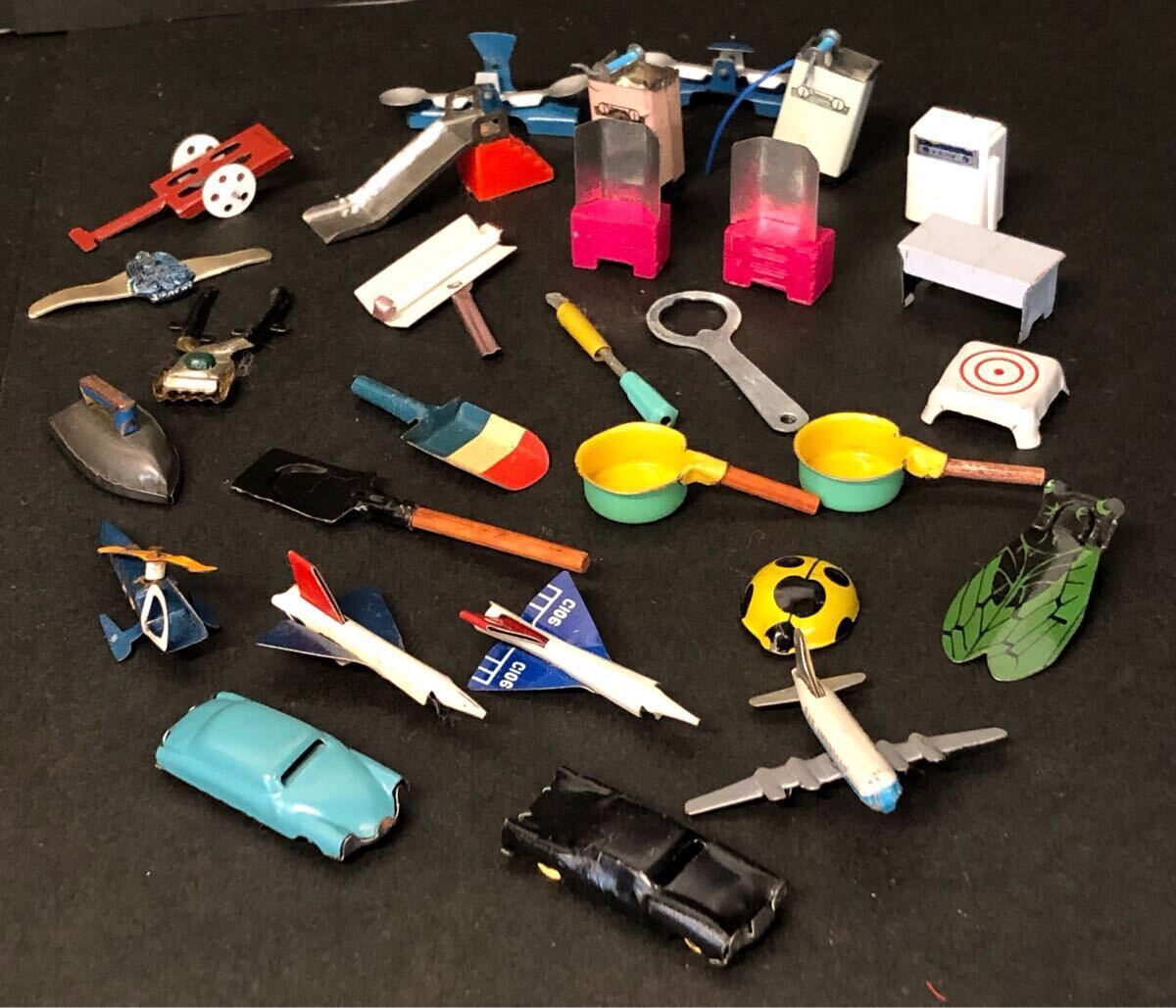 グリコ 不二家 など おまけ ミニチュア 玩具 木製 ブリキ 車 戦車 飛行機 ヘリコプター 家具 時計 家 カメラ など 約190点