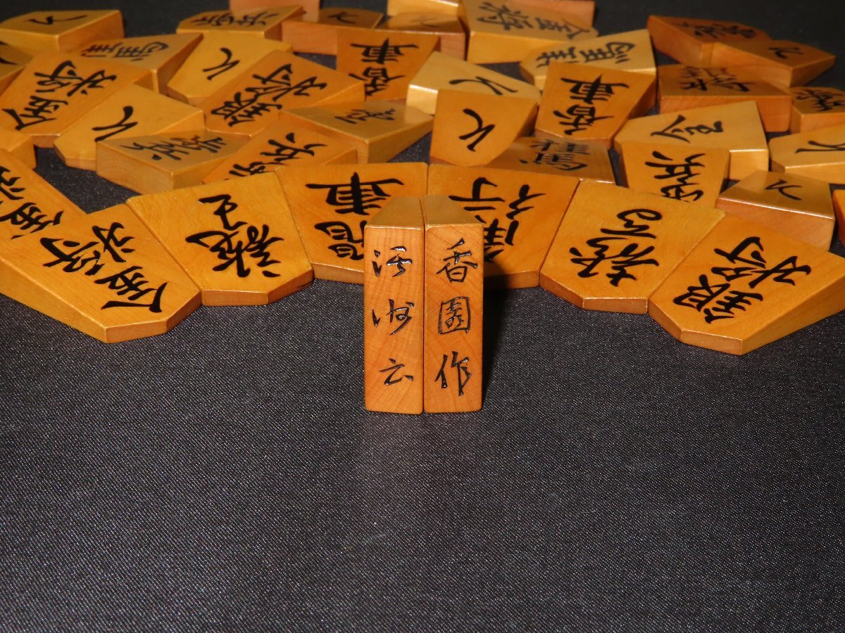 「淇洲駒」とは有名な「関根錦旗」を含む淇洲直筆の鳥海黄楊五組、版木の薩摩黄楊五組、伊藤駒七組を指すようですが(ここまでは淇洲直筆の駒箱が付きます、伊藤駒はその一組を私のHPの「トウシン名品館」に掲載させていただいております)、本作は(オリジナルとの親近性としては、淇洲から直接に駒字を贈られていることから)それに次ぐ作品と言えると思います。木地は御蔵島黄楊だと思います。香園の淇洲は全て「双玉」です。
