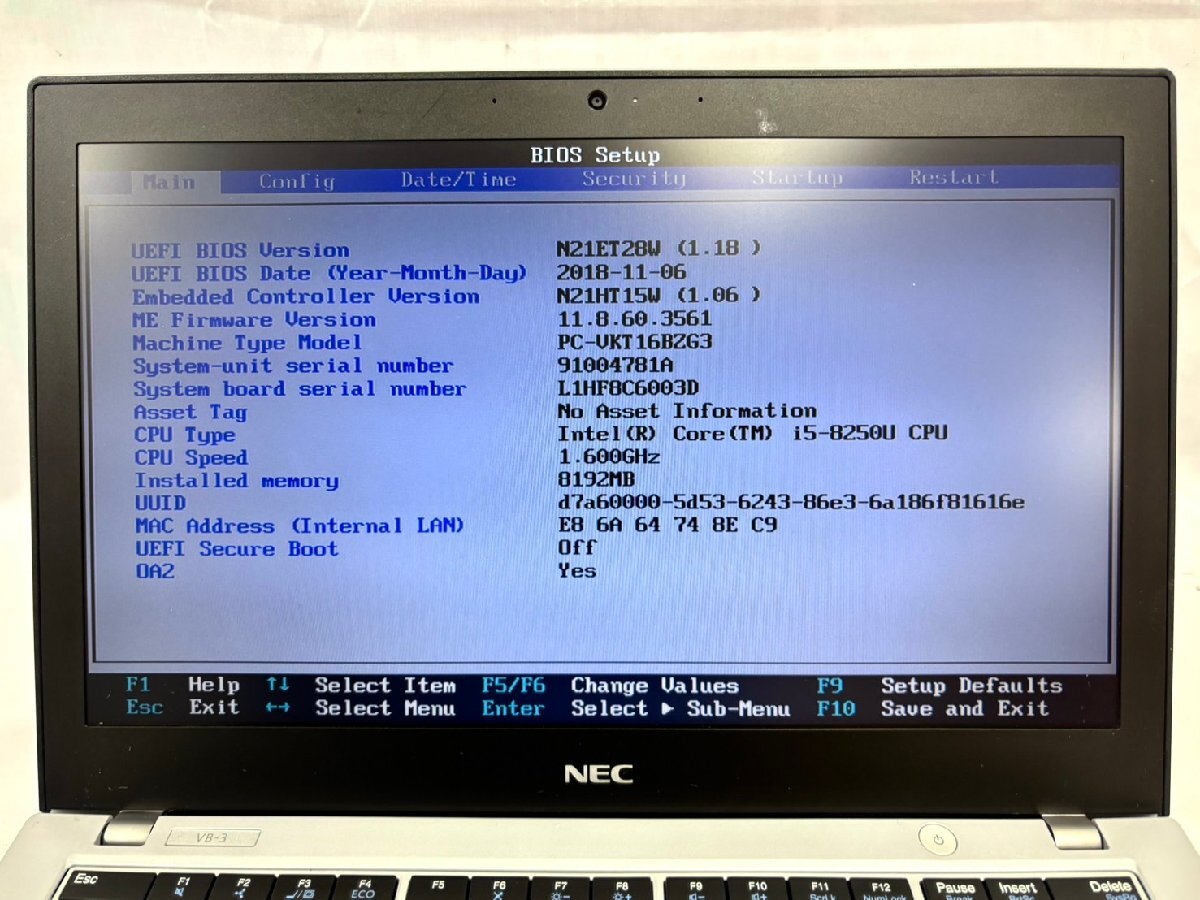 MH2401S【第8世代 i5・ジャンク品・BIOSロック】VersaPro PC-VKT16BZG3 CPU:Intel(R) Core(TM) i5-8250U @1.60GHz メモリ:8GB SSD:256GB N