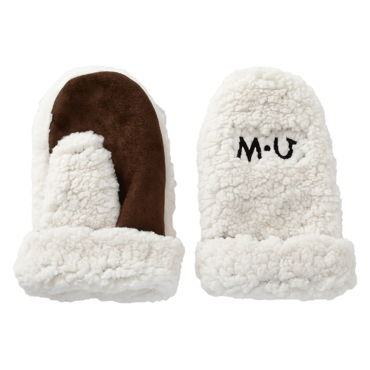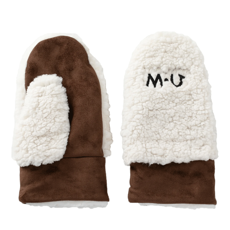 ロゴ刺繍が入ったモコモコシープボアのミトングローブ。