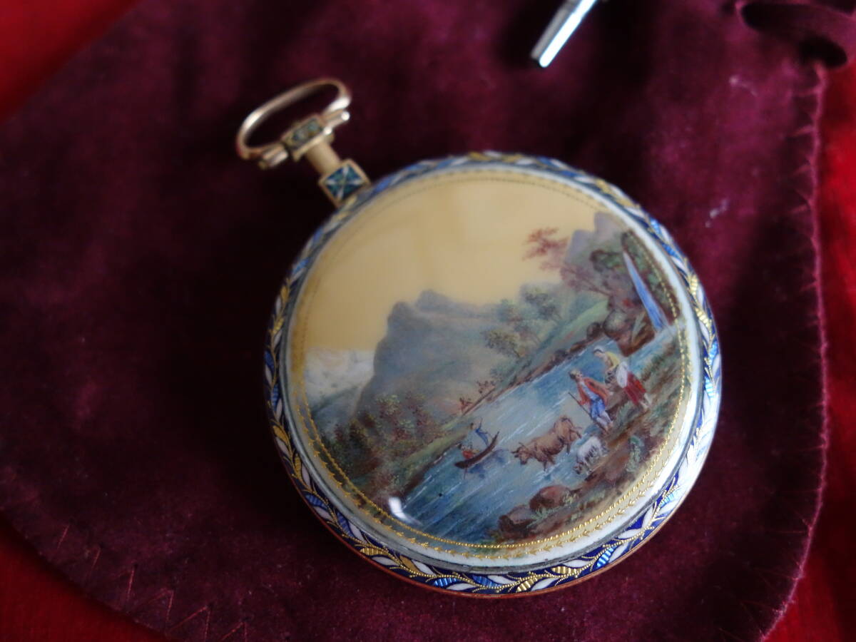 ヨーロッパの庭園風景を裏蓋に繊細なエナメル画で描いた、大変綺麗な時計です。