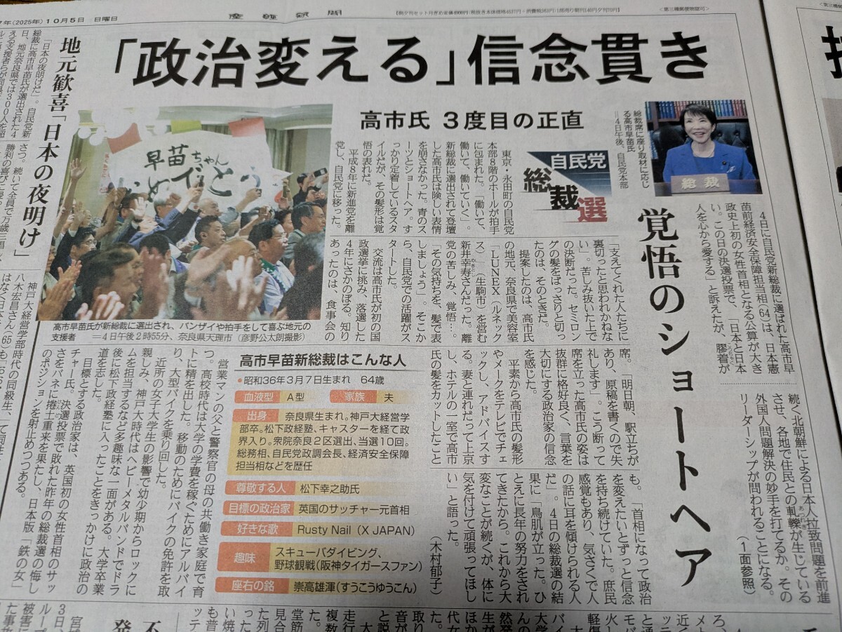 2025年10月5日産経新聞朝刊【自民総裁に高市早苗氏】日本政治のビッグニュース自民党総裁選で高市早苗氏が女性として初めて勝利しました。