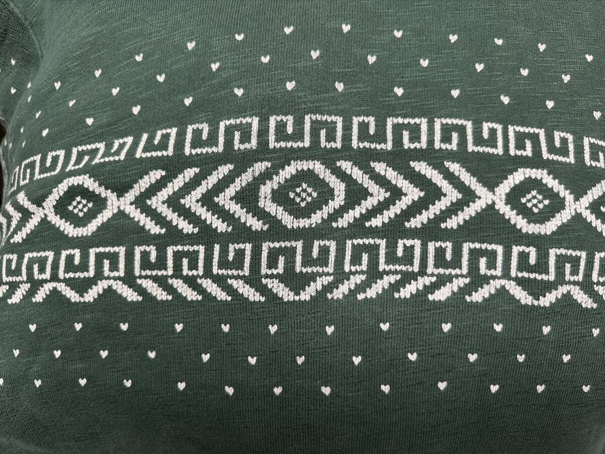 ネイティブ柄のプリントが胸に、袖口にストライプ、
