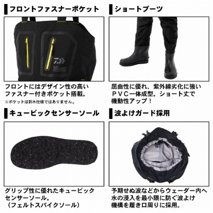 • 予期せぬ波などからウェーダー内への水の侵入を最小限に防ぐ波よけ機構を履き口周りに採用