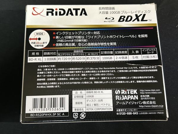 RiDATA ブルーレイディスク BDXL 100GB 4倍速 5枚組 BD-R XL 旧家整理品になります。