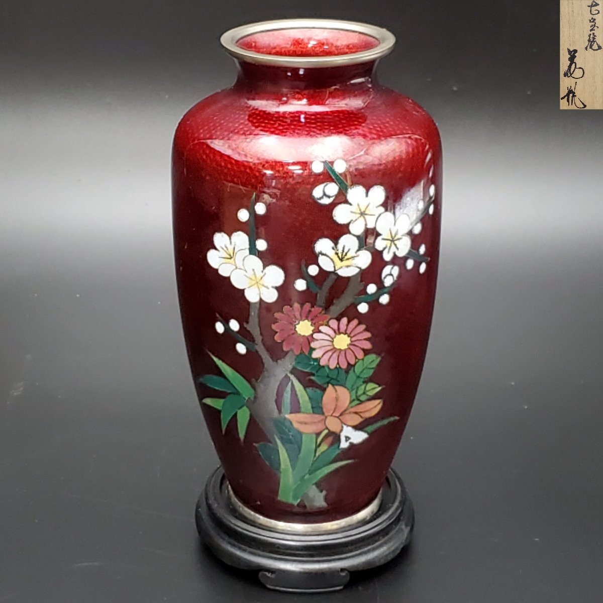 Product name: 【宝蔵】佐藤七宝 七宝焼 赤透釉花文花瓶 高さ約18.5cm 513g 花器 共箱