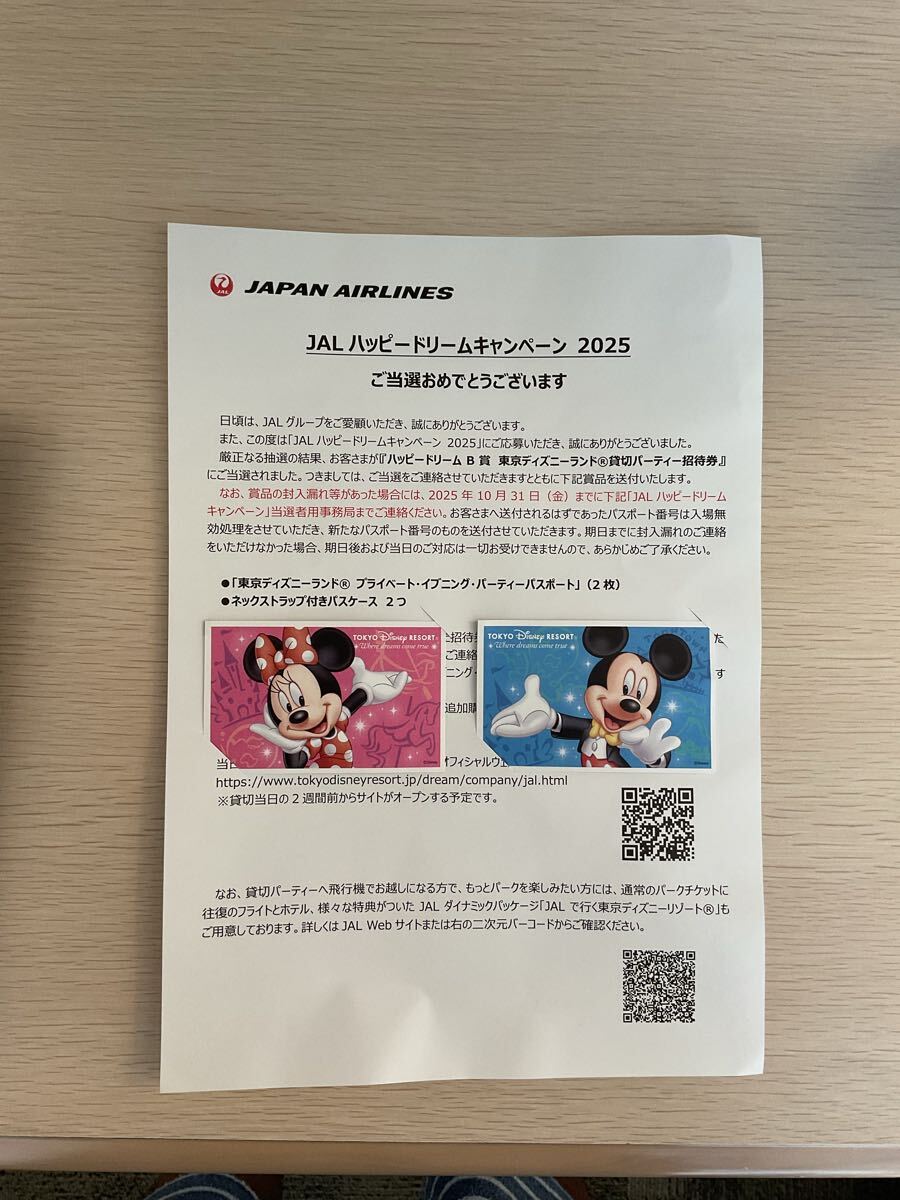 JAL主催の東京ディズニーランド プライベートイブニングパーティーのチケット2枚とJALオリジナルネックストラップ付きパスケース2つのセットです。