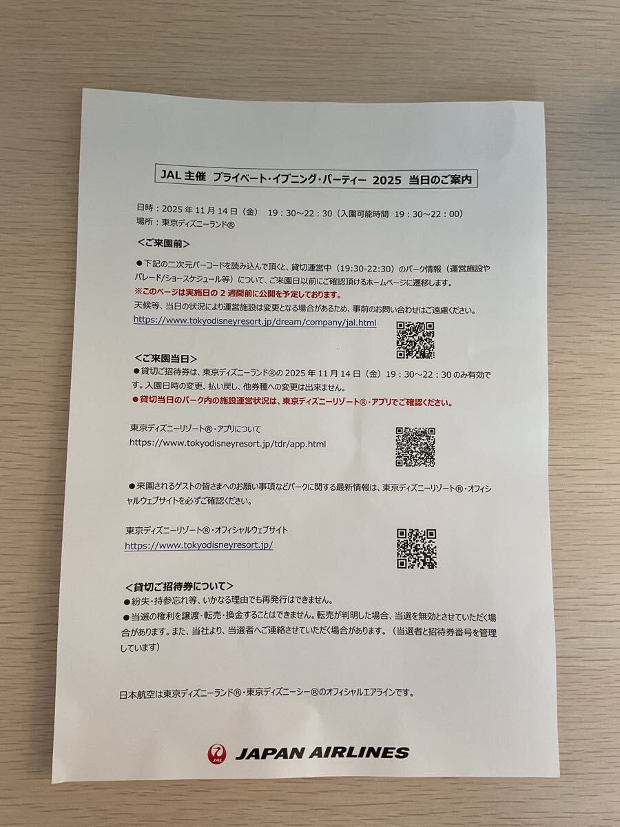 東京ディズニーランド JAL主催 貸切 チケット イブニングパーティー2025