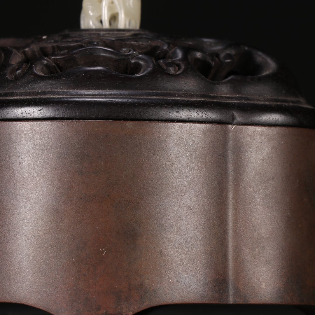 Product name: 【安】明時代 在銘 銅胎 双獅耳海棠形香薫炉 和田玉摘鈕 紫檀木蓋台 極細工 古置物 中国古美術 時代物 古董品 371