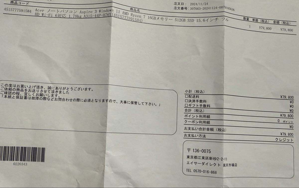 Product name: 未開封品 acer Aspire3 15 ノートパソコン 15.6インチ A315-44P-H76Y