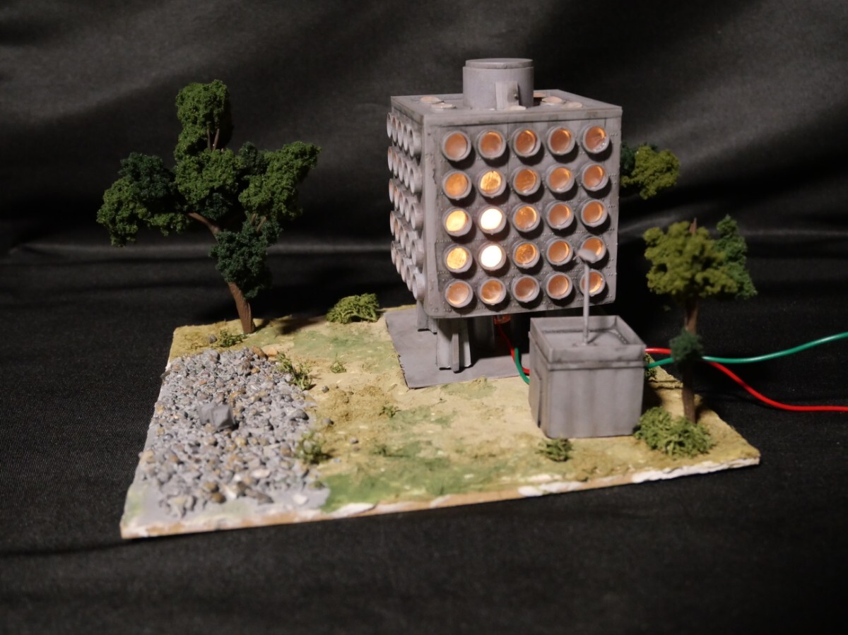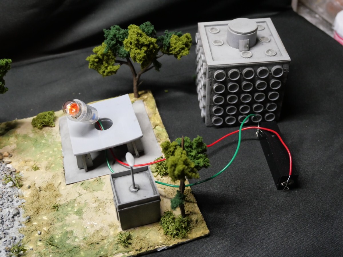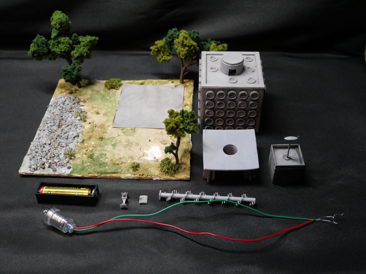いろいろとギミックがあり、まず屋上のドアは開けたり閉めたりできます、次に百窓の家自体にはあったらしい螺旋階段を付けています、是非入り口からご覧下さい、そしてなんと本体は上側を外すことができます、下側のベースは接着しているのですみませんが外されません。そのため豆電球を入れたら光るので夜のジオラマとしても使えます(^^)ついに豆電球により夜のジオラマとしても遊べるようにぬりました(^^)豆電球と電池のセットもお付けいたします。是非遊んで下さい(^^)