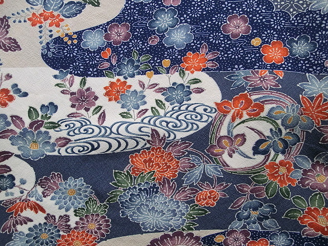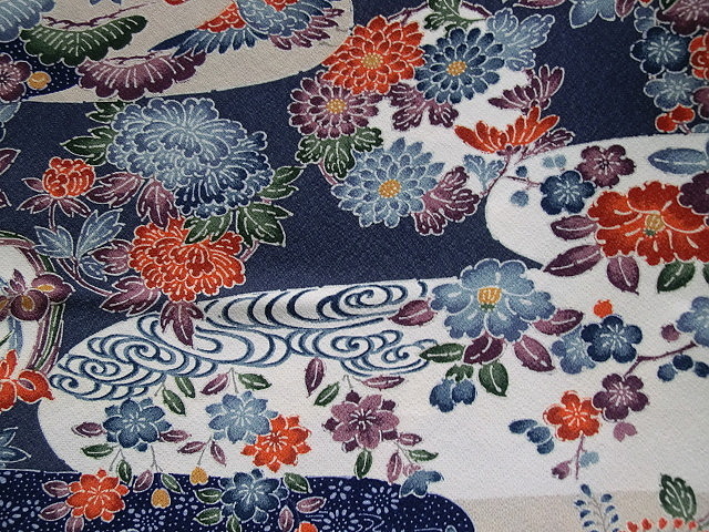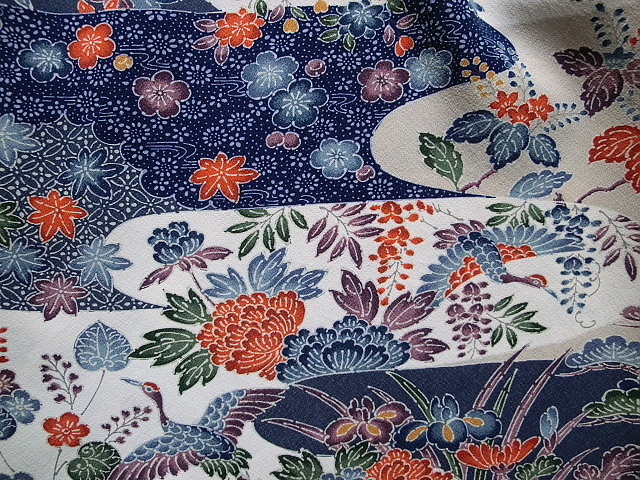 アイボリーに灰青で、和柄でよく使われる花木、雲に流水、鶴など、定番柄を集めた生地です。