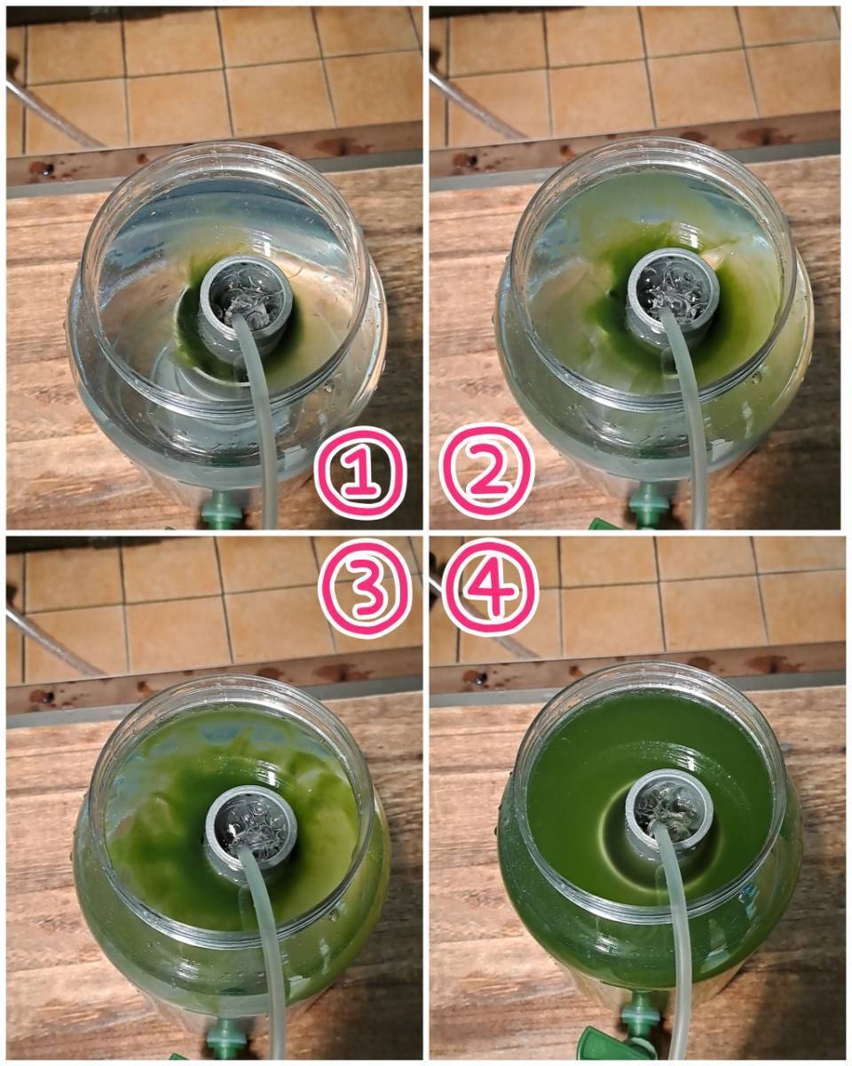 本商品による攪拌(かくはん)の様子です。エアーリフト機能によりミジンコの餌となる生クロレラ(PSB等)が画像にあります様に緩やかに落ちるような水流で良い感じに全体に攪拌される仕様となっております。それに伴いミジンコの死滅を防ぎつつ、飼育密度をあげることが期待されます。