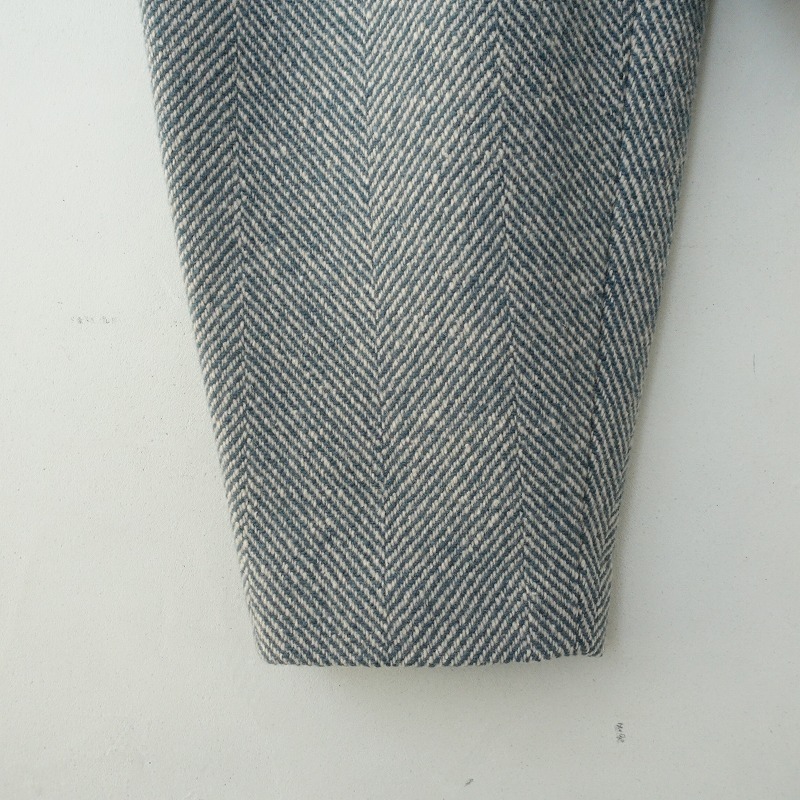 mina perhonenのesperer オールインワンです。カラーはブルーグレー×オフホワイトのヘリンボーン織で、毛×カシミヤ混紡の起毛素材です。腰前後にタック入りのテーパードデザインで、背上部にボックスタック入りです。ボタン&ジッパーで着脱でき、前腰左右にポケットがございます。裏地付きで、身頃裏のみSleeping Roseプリント柄生地です。