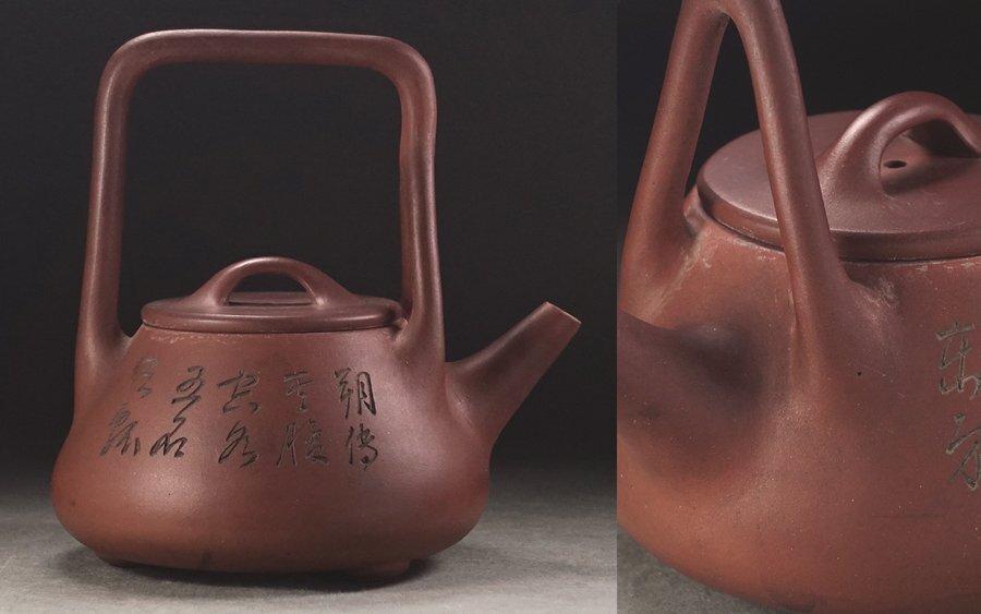本品は朱泥を用いて制作された急須(茶壷)で、表に「石瓢」と大きく二字を刻んだ上で、表裏表面に漢詩を記しています。 (解読不能でした…申し訳ございません)
