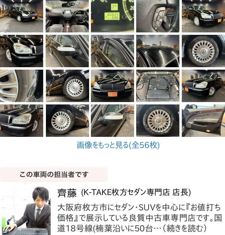 K-TAKE枚方店は国産セダン・SUV・ステーションワゴンを中心に取り扱いしております。趣向性の高い車種になりますので、専門知識を持ったスタッフにてご案内させて頂きます。コーティングやカスタム等はもちろん、任意保険、オートローンまで安心のカーライフをお約束致します。整備、保証などのアフターサービスも当店ですべて行えますのでご安心ください。当社は全国のオークション会場、約160カ所と業務提携を結んでおります。全国60000台以上の中古車を当店でご商談、ご契約、ご納車可能です!