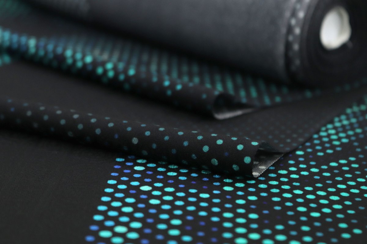 全体には青色、翡翠色、水色、ロイヤルブルーのお色目で、水玉模様の大小がグラデーションのように市松状に配されております。