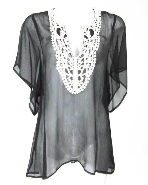大人可愛いカジュアルがキマるプルトップブラウス☆しわ加工が施されたシフォン生地がさらりとエアリーな1枚です。大きく開いたキーネックを飾るレースがシックな黒に映える、華やかで可愛いデザイン。ゆったりと女性らしいシルエットです。インナーとのコーディネートをお楽しみください。