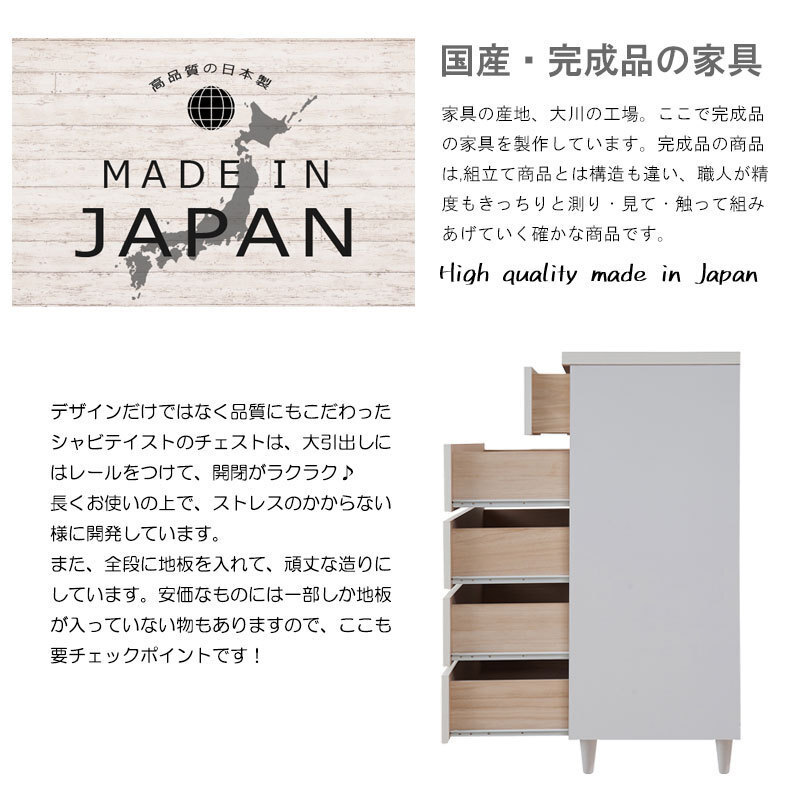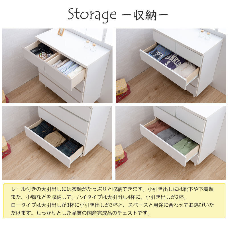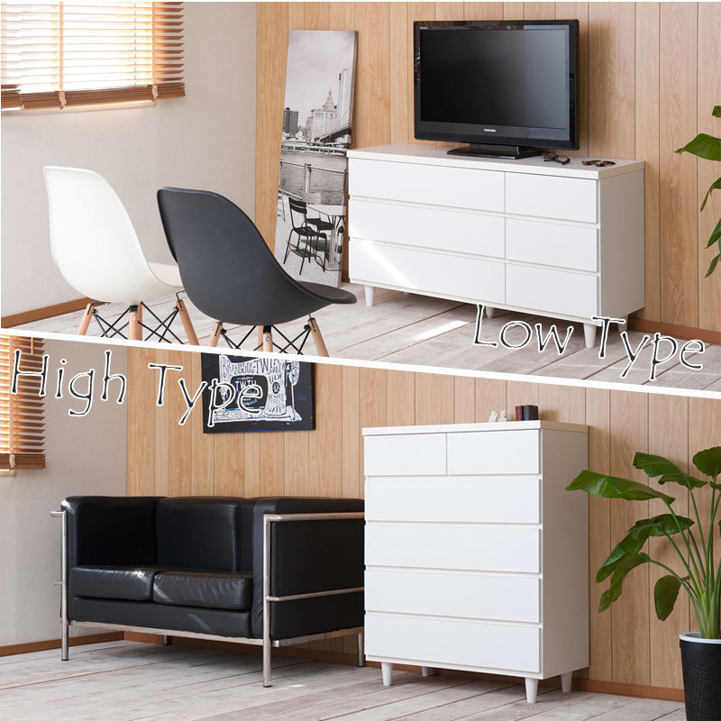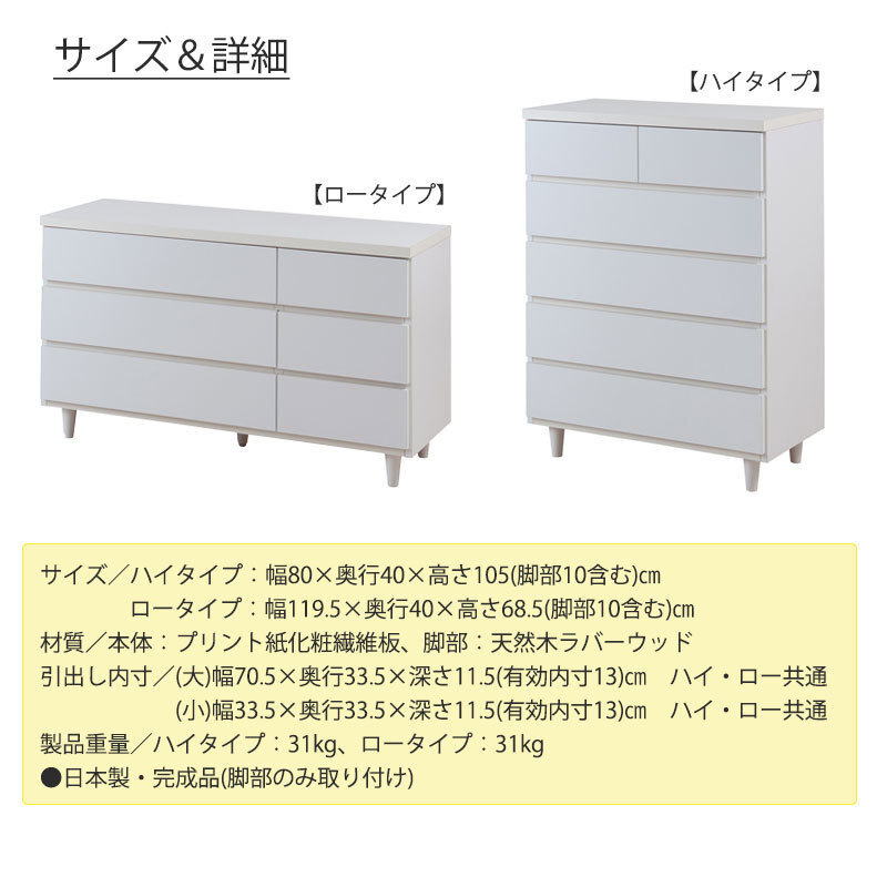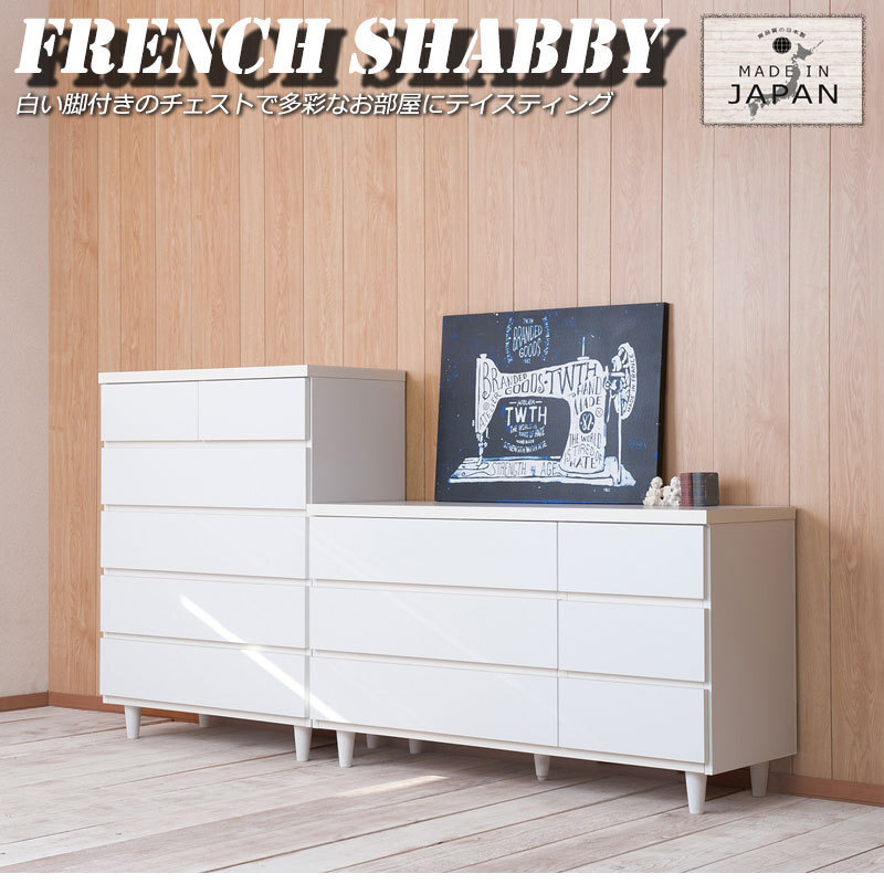 ◇白い脚付きのチェストで多彩なお部屋にテイスティング。居心地の良い空間を作り上げる『LEG』シリーズ。古びた空間に、白を基調とした家具を配置することでフレンチシャビーなお部屋に。ワンポイントとなる家具に白を配置することでシャビーテイストのお部屋にアクセントをもたらす。軽やかな脚付きで、よりスマートにお部屋を演出します♪レール付きの大引出しには衣類がたっぷりと収納できます。小引き出しには靴下や下着類また、小物などを収納して。ハイタイプは大引出し4杯に、小引き出しが2杯。ロータイプは大引出しが3杯に小引き出しが3杯と、スペースと用途に合わせてお選びいただけます。