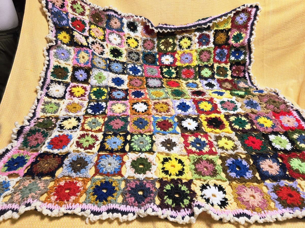 編み物が大好きなおばあちゃんがコツコツと編み上げました。カラフルでとっても可愛いお花のモチーフの大判 クロスです。 お部屋のインテリアとして いかがでしょうか?ソファーのカバーやベッドカバーなど使い方は色々です。 お部屋はパーッと明るくなると思います。 柄やデザインは頑張って画像に収めましたのでご覧いただけたらと思います。素人の手作り作品でございますのでご理解のいただける方のご入札をお待ちいたしております。
