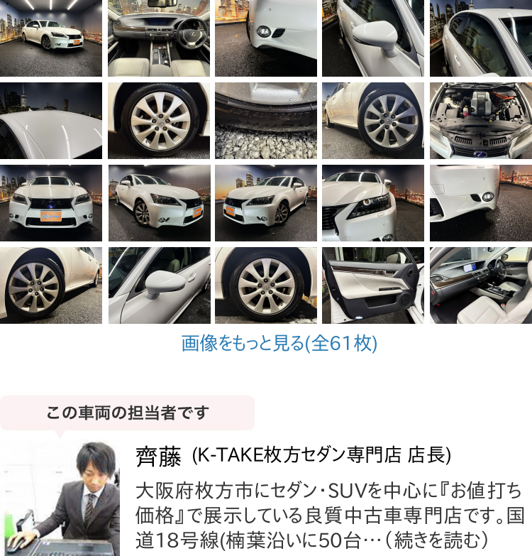 K-TAKE枚方店は国産セダン・SUV・ステーションワゴンを中心に取り扱いしております。趣向性の高い車種になりますので、専門知識を持ったスタッフにてご案内させて頂きます。コーティングやカスタム等はもちろん、任意保険、オートローンまで安心のカーライフをお約束致します。整備、保証などのアフターサービスも当店ですべて行えますのでご安心ください。当社は全国のオークション会場、約160カ所と業務提携を結んでおります。全国60000台以上の中古車を当店でご商談、ご契約、ご納車可能です!