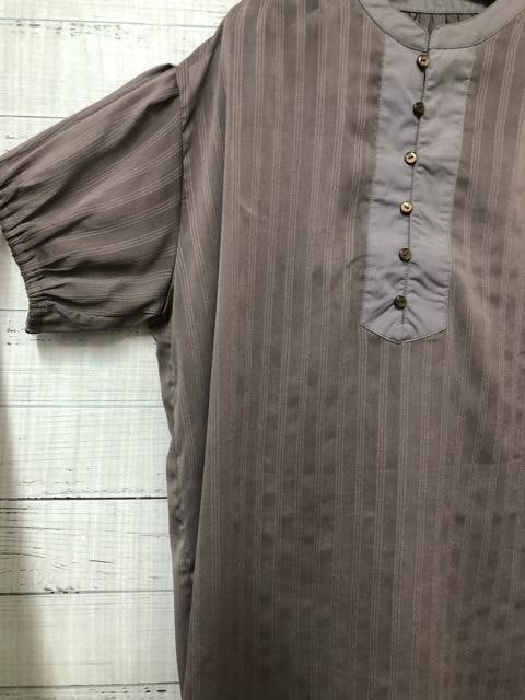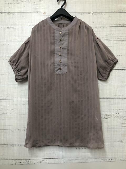 シアーなストライプのプチパスリーブの長め丈ブラウス
