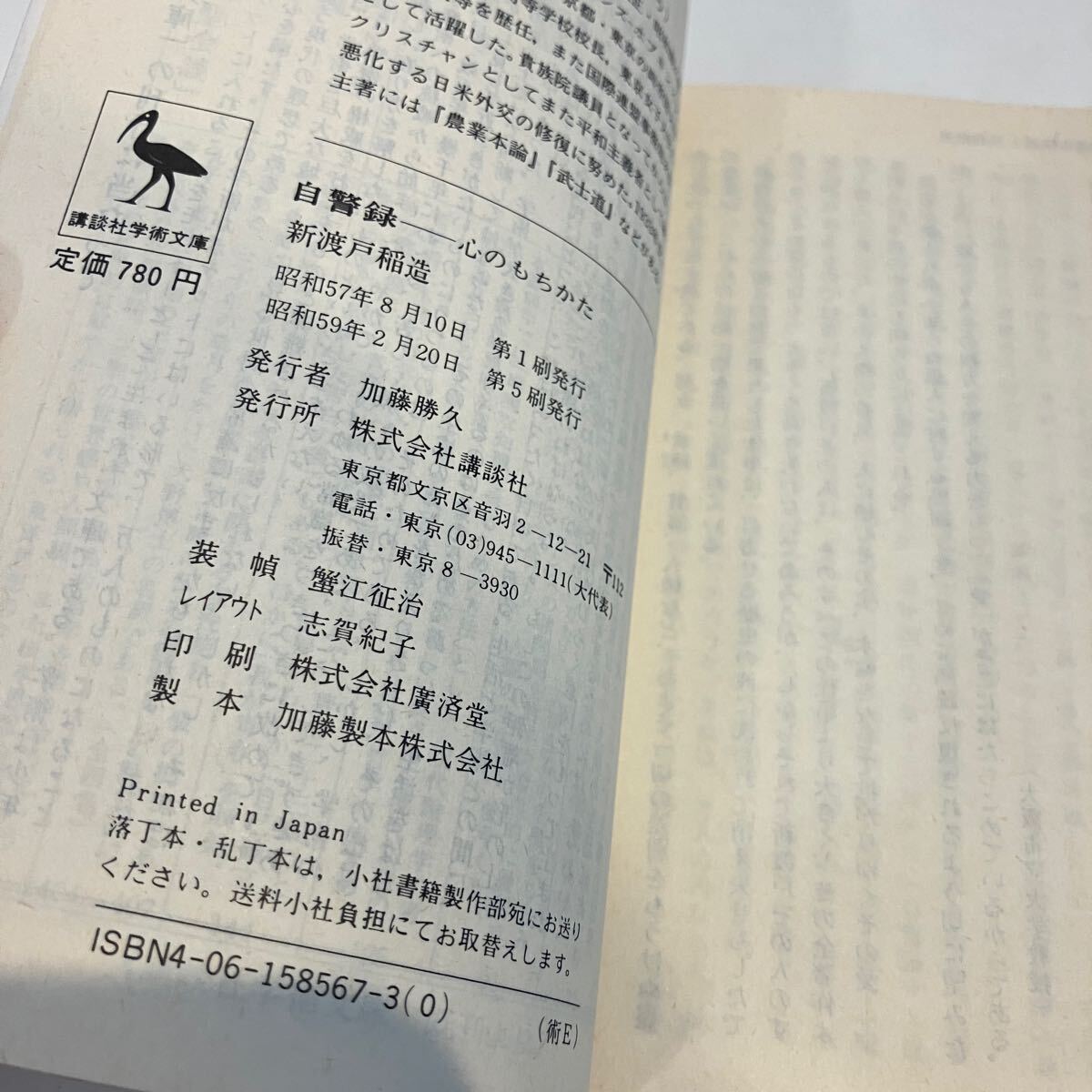 Product name: 250125 講談社学術文庫「自警録」心のもちかた 新渡戸稲造 昭和59年5刷★希少古書絶版