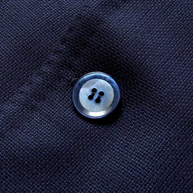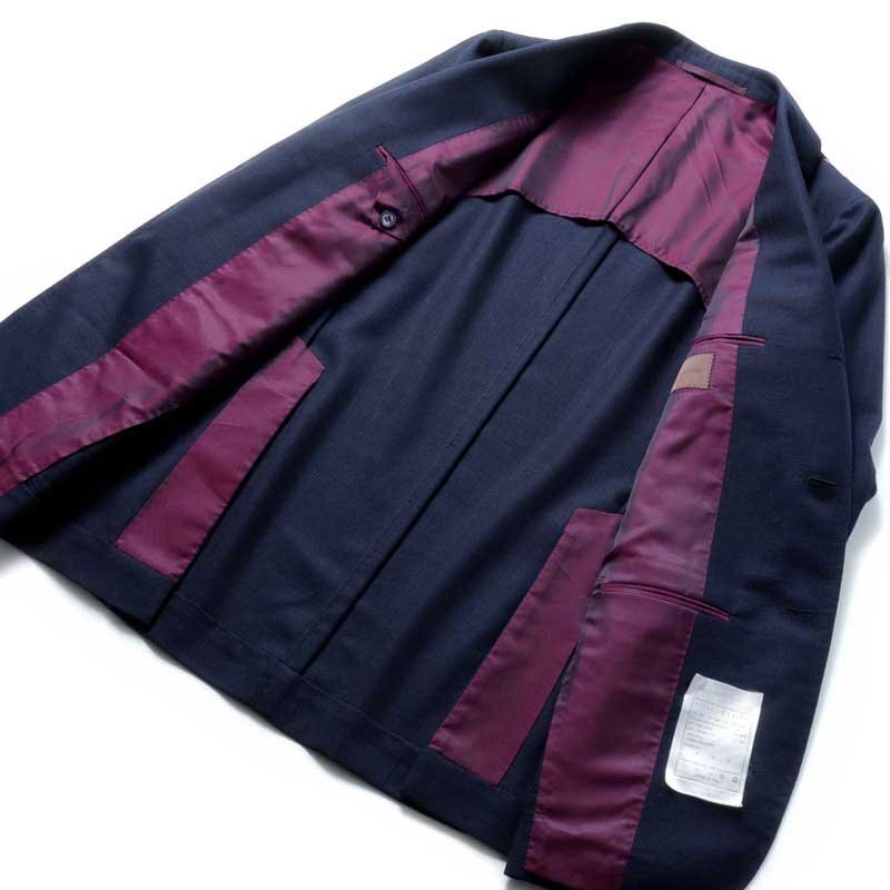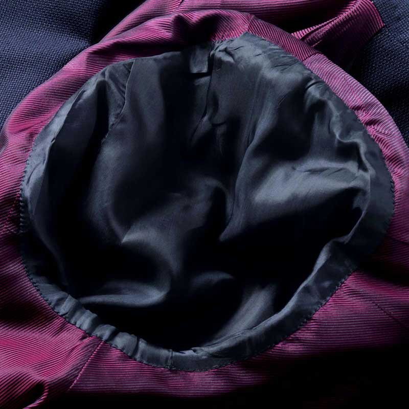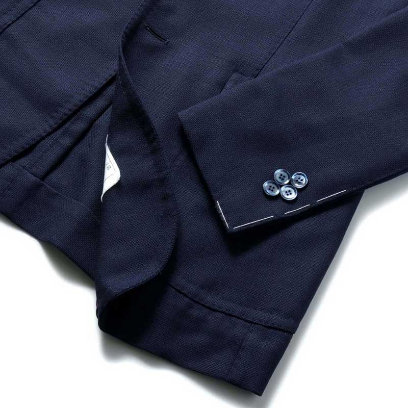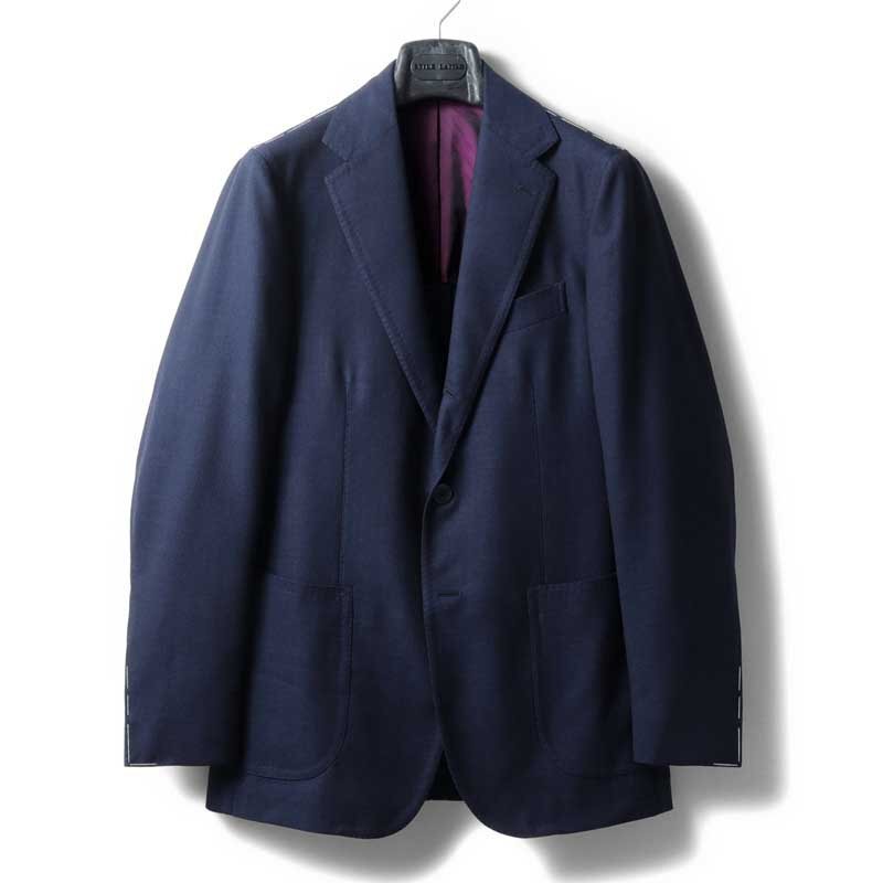 ・肩から首にかけての吸い付くようなフィット感の美しいのぼり、立体的でふんわりと仕上がったふくらみのあるラペル、ナチュラルな弧を描く前振り袖、ウエストが程よくシェイプされた美しいシルエット、上質な芯地を使用した柔らかなショルダーライン(マニカカミーチャ)など、伝統的なナポリ仕立てをベースにハンドを駆使してつくられています。