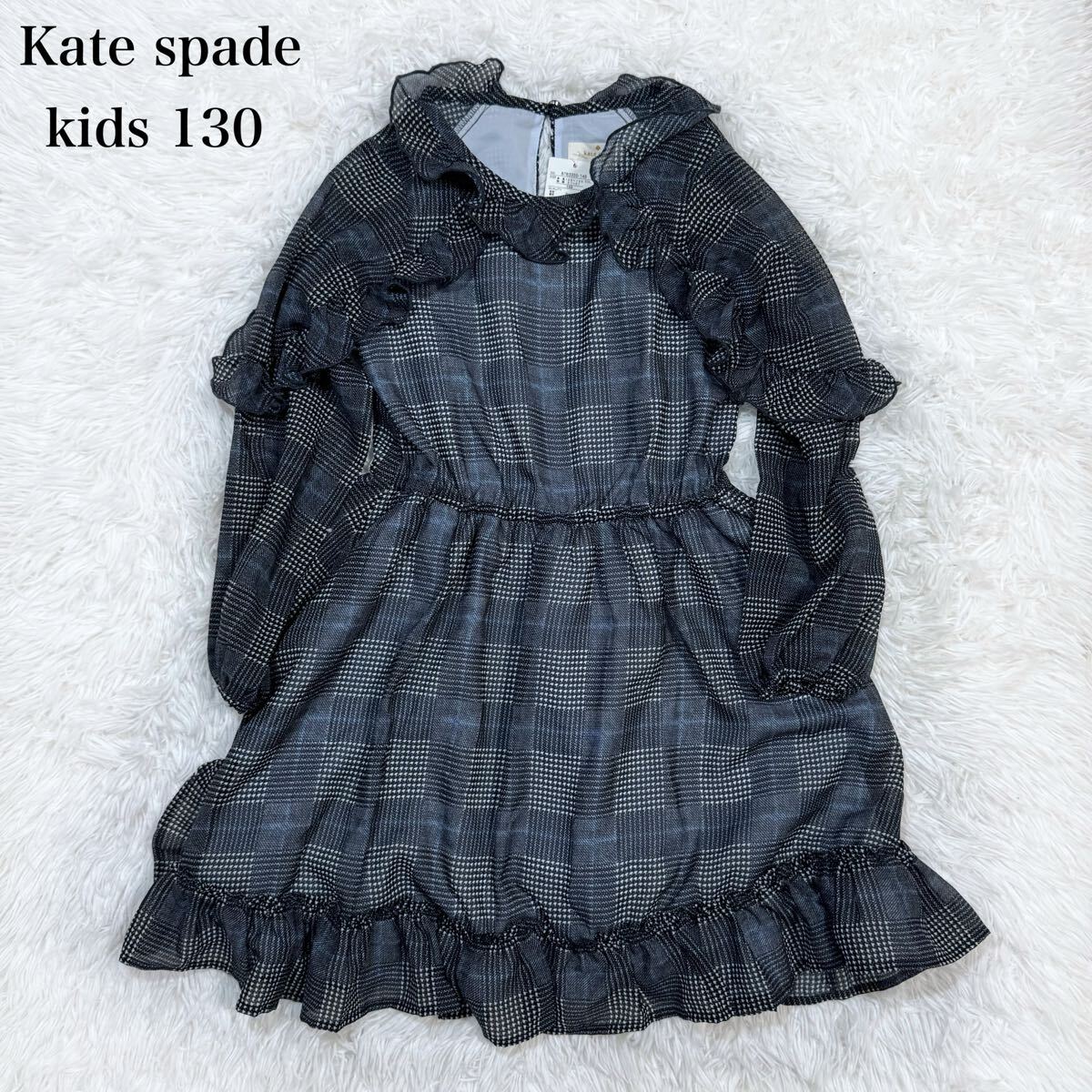 新品タグつき!Kate spade ケイトスペード ワンピース 130 フリル チェック シフォン ネイビー系 ガールズ