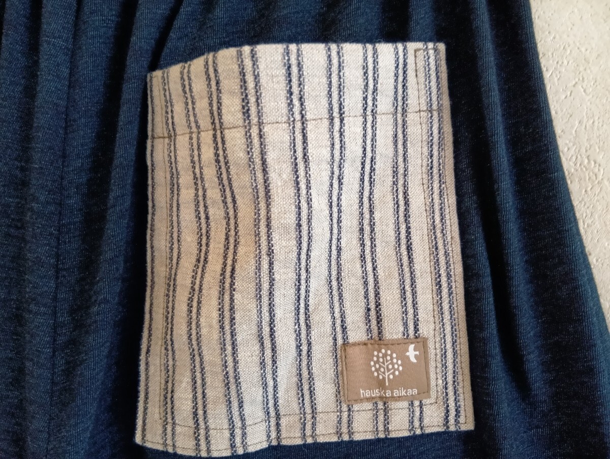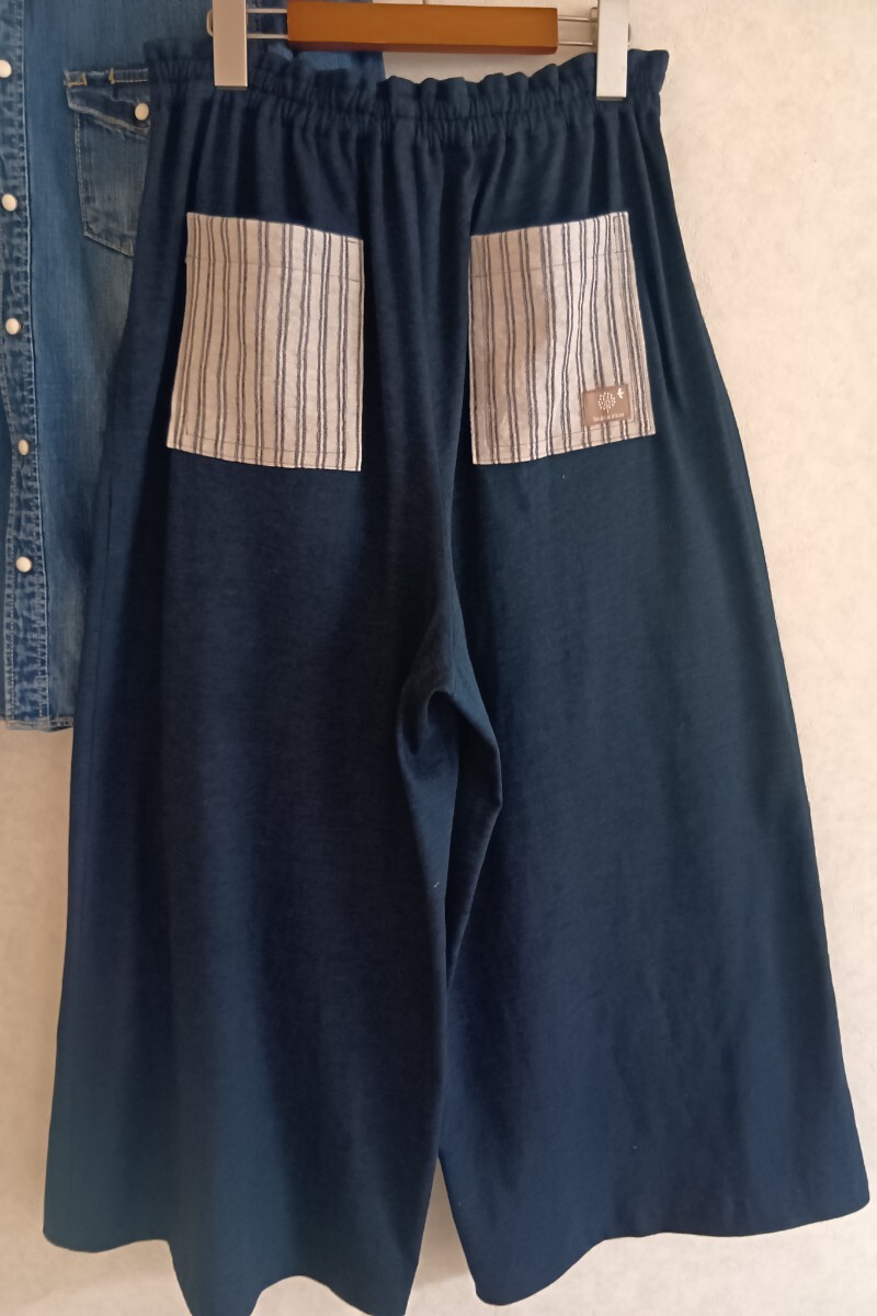 杢インディゴブルーのニットで仕立てたエアリーで涼し気なフレアーパンツです。後ろにリネンストライプのスクウェアポケットを付けました。ウエストはゴムで通し穴があり、調節、取り換え可能です。
