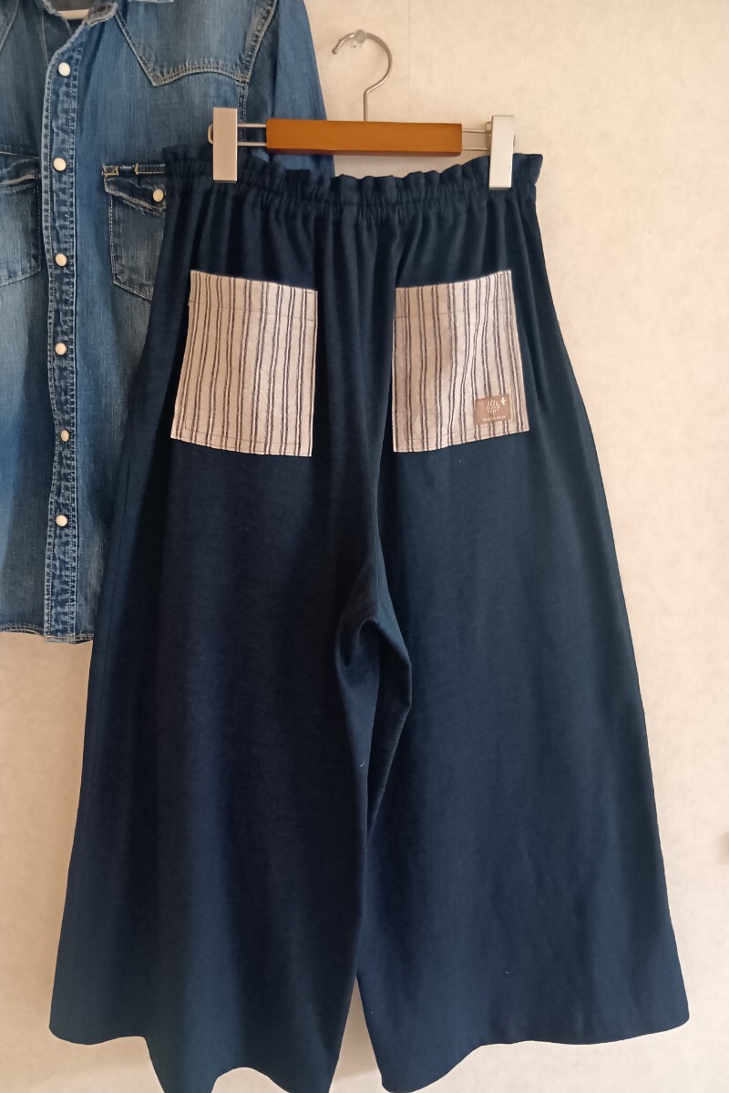 +杢インディゴニット+イージーフレアーパンツ+リネンストライプポケット+ハンドメイド+ウエストゴム+MLサイズ対応+by*see_ya+