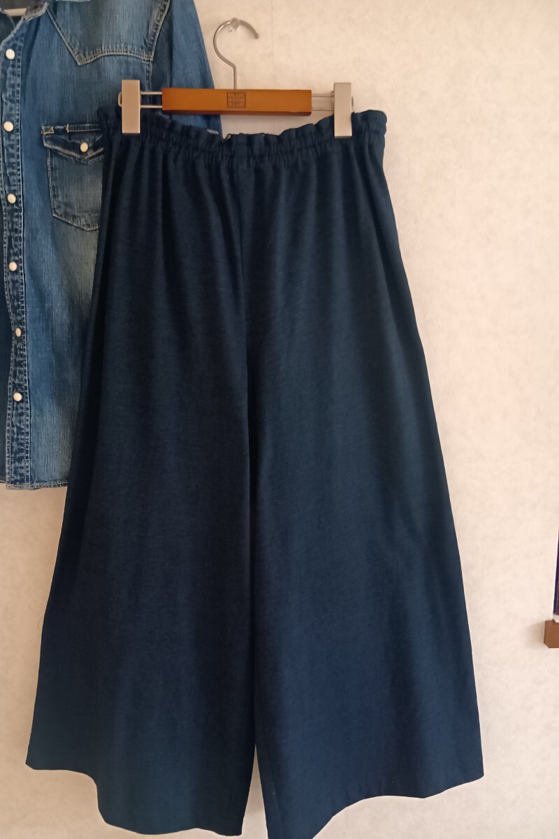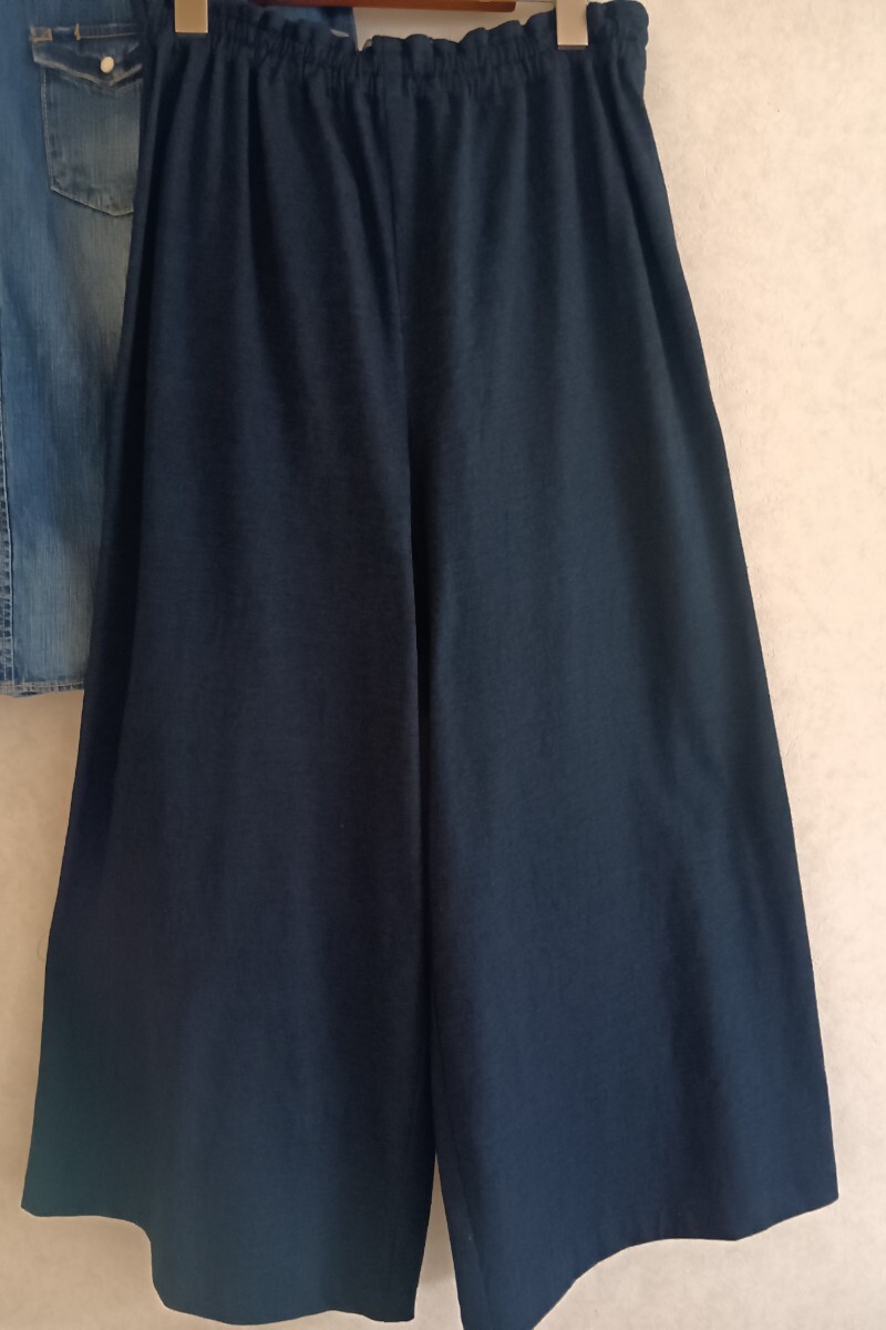 ※※パンツのシルエットは後ろパンツのパターンの傾斜が決め手です。これは傾斜がゆるく、その分わたり巾を取った、体の厚みをカバーするシルエットです。横にばかり広がる様なシルエットにはなりません。お試しください。
