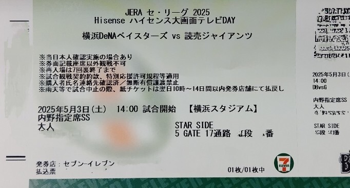 Product name: 〈通路近〉5/3 土 横浜対巨人 内野SS 1枚