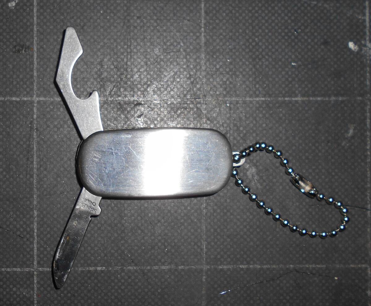 多機能ナイフツールです。デザインは金属プレートにエッチング、色射し着色され表面はエポキシ樹脂でコーティングされています。キーホルダー、ナイフ、栓抜きの3機能です。サイズは45mmx27mmです。デッドストック未使用品ですが経年劣化あります。ノークレーム、ノーリターンにて対応お願いします。定形外郵便(特定記録付き)360円発送でいたします。