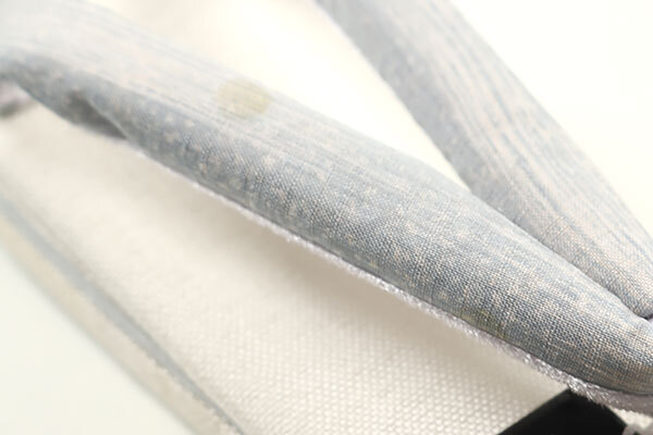 こちらのお品は、水色、落ち着いた白色、青色、黄色などのお色目で雨の様な縞や水玉模様が染められた鼻緒がすげられております。