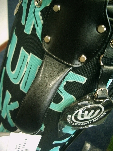 未使用 ミエコ ウエサコ レディース ビッグ文字プリント・デザイン 合繊素材 黒エメ・グリーン ゴルフバッグ