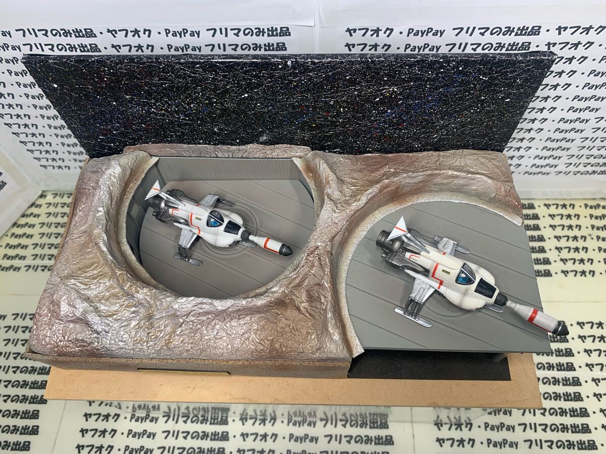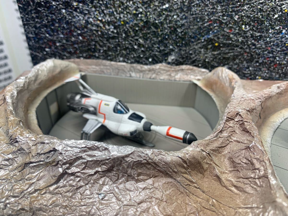 ★送料無料★ジオラマ「謎の円盤UFO スクランブル」★ケース付き★模型作りが高じて、コナミ のSFムービーセレクション インターセプターを使って、ムーンベースからインターセプターがスクランブル発進するシーンを表現しました。★飛行中のインターセプターのお腹の部分に穴を開け、噴煙(飛行状態にすると、インターセプターのバランスが悪くなりますので、位置等を調整しながら配置して下さい。)を差し込んでいるので、取り外せば、着陸状態にもできます。★インターセプターを飛行状態にする場合、手前のリフトアップしたカタパルトからの発進になりますので、カバーを取り付けることはできません。奥のカタパルトに飛行中のインターセプターを配置して、カバーを取り付けることは出来ますが、カタパルトが完全にリフトアップしていない状態からの発進になります。★ジオラマのカバーは、エポック社のコレクションケースを使い、カバーをつけたサイズは、幅約29.5㎝、奥行約16.5㎝、高さ約13.5㎝.重量約700gになります。★私の作風をインスタグラムhttps://www.instagram.com/diostudio3にアップしていますので、お楽しみください。★