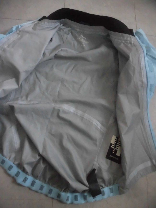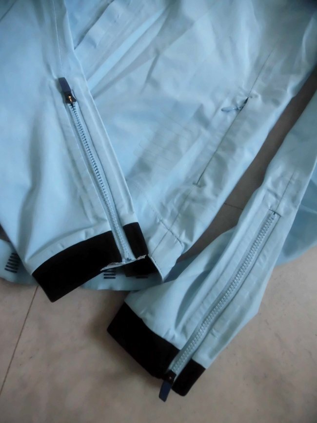 フォルムは必要最小限にスリム化されている。フードもはじめから無いが、これはヘルメット側でキャップをかぶるなりして滴りを防げば良いことだ。天候の心配のある日のロードライドに心置きなく連れ出せる。ポケットにウィンドブレーカーでなくレインジャケットがあるというのは、大きな安心だ。タイトフィットのため、少し太めの体型の人にはキツ目かもしれないが、生地自体に伸縮性があるのである程度は体型に合わせてくれる。ソフトで突っ張る感じもない。ただし腕ぐりは欧米人比率に沿ってやや長めであるため、腕の短めの人は余ることが気になるかもしれない。生地はゴアテックス等と同様の、防水性に透湿性を備えたブリーザブル(呼吸する)タイプだ。厚みがあるため、気温の高い日の強度の高めのライドでは暑くなることもあるだろう。一方で寒い時期には暖かいため、防寒シェルとしても使えるため単なるレインギア以上に活用ができる季節があると思う。袖、襟口のネオプレーン生地はあたりもソフトで着心地は良い。夏季は熱のこもる原因にもなる反面、レインウェアにありがちなガサガサとした肌触りが無いのはありがたい部分だ。生地自体はかなり水をはじいてくれ、土砂降りでも30分ほどならば中のジャージがびしょ濡れになることも無い。フロントジッパー部分を隠すフラップはファスナーからの水分の侵入を十分に防いでくれた。生地と生地の接合部分の止水加工もかなり効いているようだ。