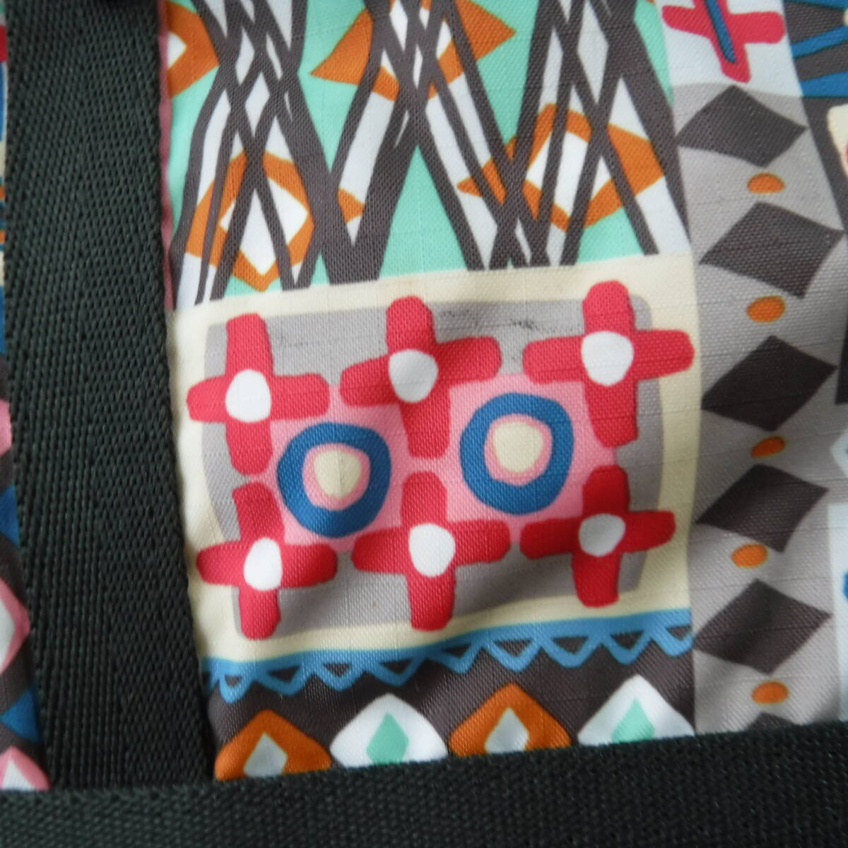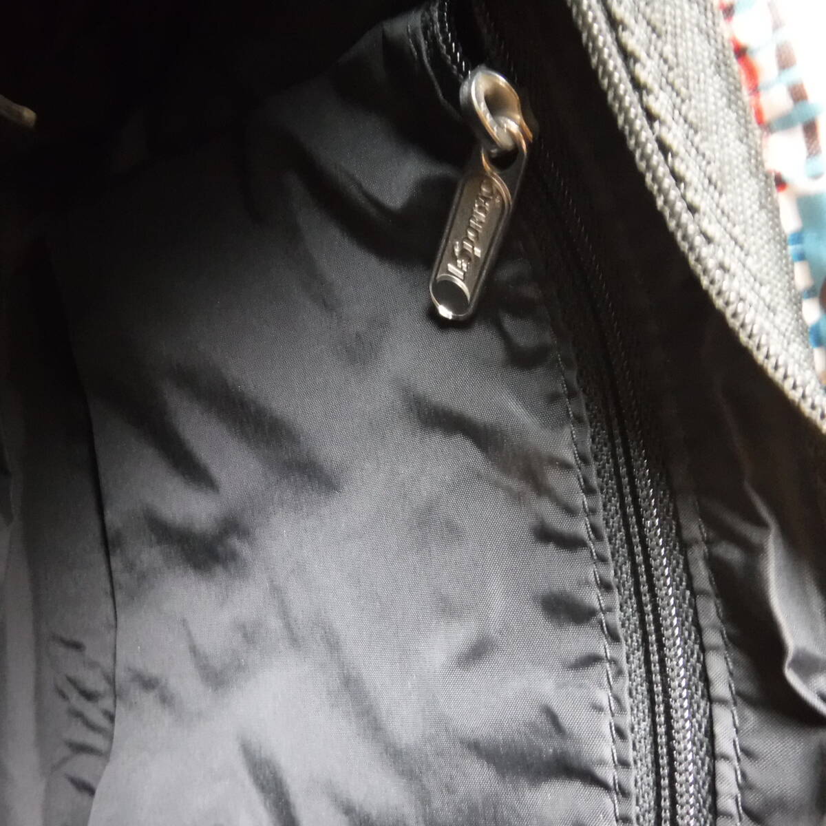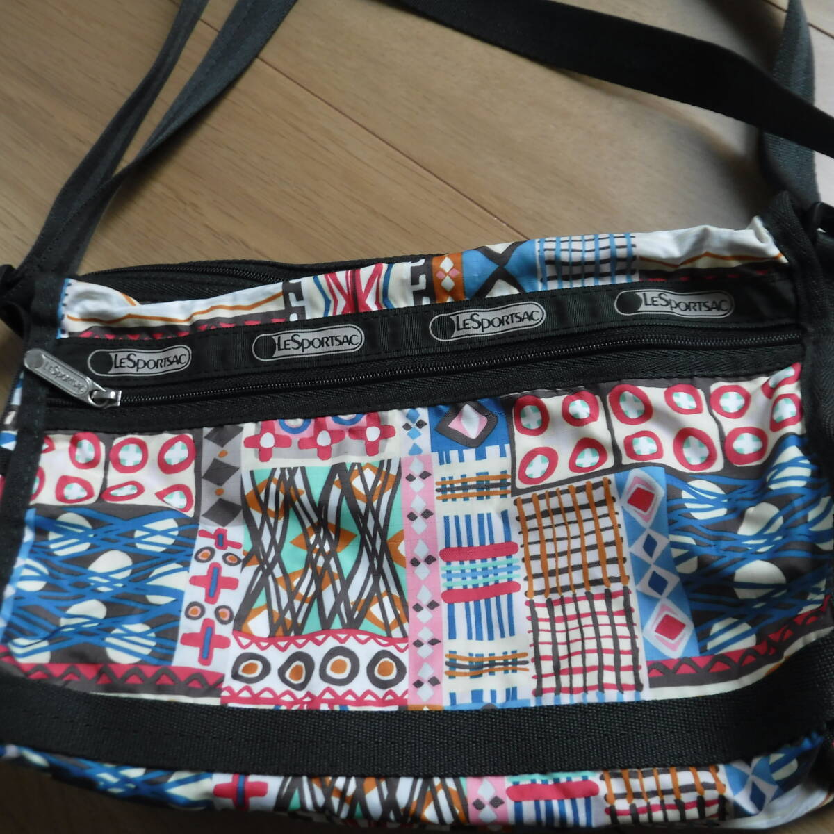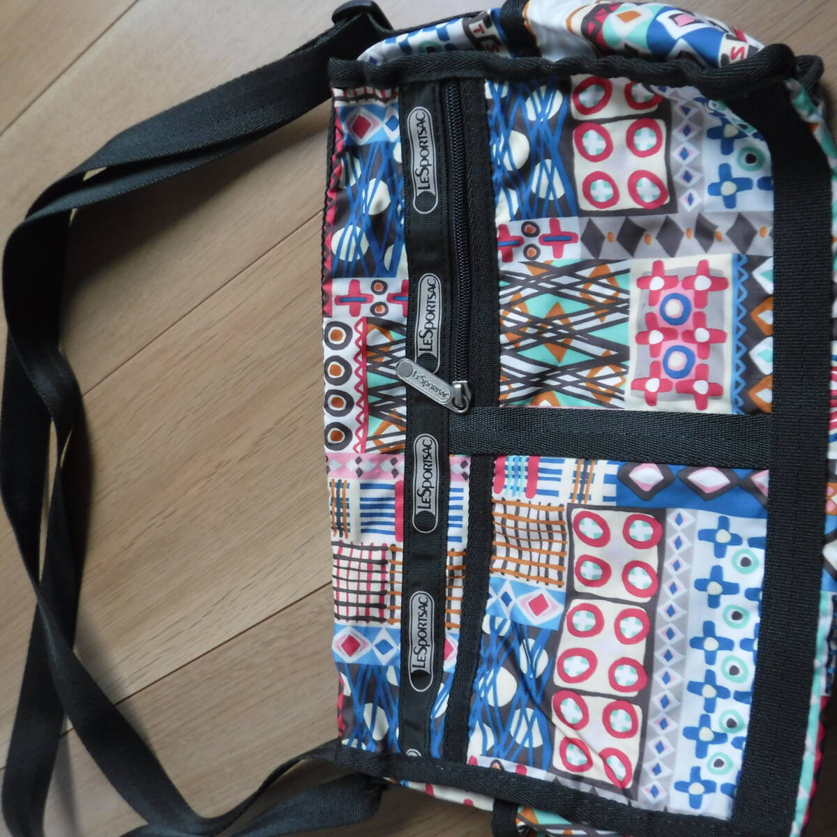 レスポートサックのカラフルな幾何学模様のショルダーバッグで、形はデラックスサッチェル、サイズは個人寸法で横30縦20マチ10センチ位、表面に5つ(内2つはチャック式)、内側にチャック式1つポケットがあり収納たくさんで便利☆内側は黒なので汚れが目立ちにくいと思います♪目立つ汚れはなさそうですが、画像5のような汚れがありますので、中古品にご理解ある方、ノークレームノーリターンでお願いします!