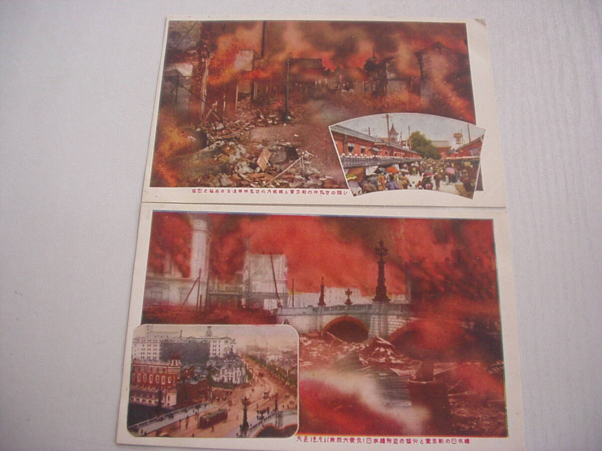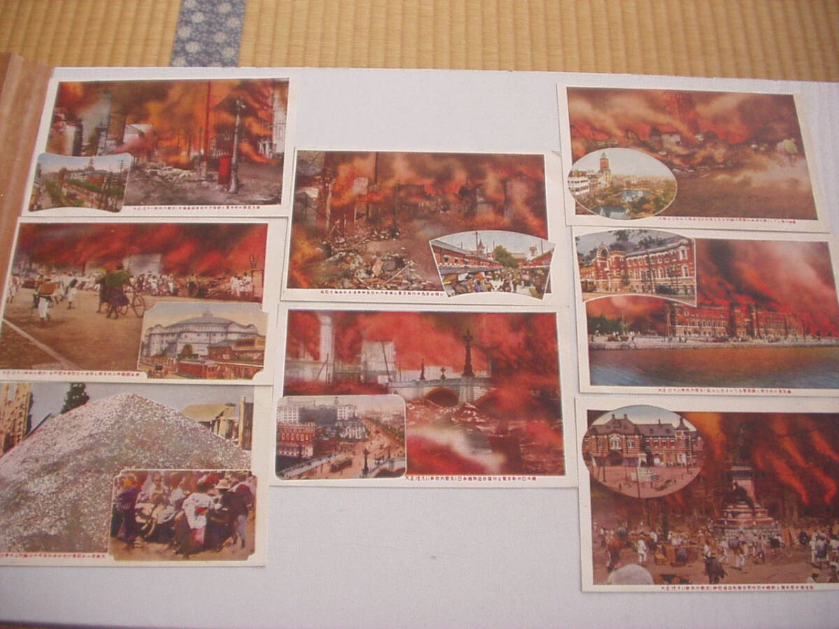 絵葉書 関東大震災 8枚 銀座街 国技館付近 白骨の山 浅草仲見世 日本橋付近 十二階 警視庁 万世橋駅 戦前 大正 カラー