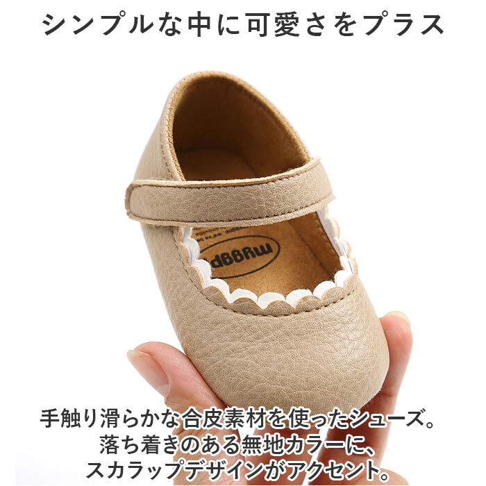 ・手触り滑らかな合皮素材を使ったシューズ。落ち着きのある無地カラーに、スカラップデザインがアクセント。