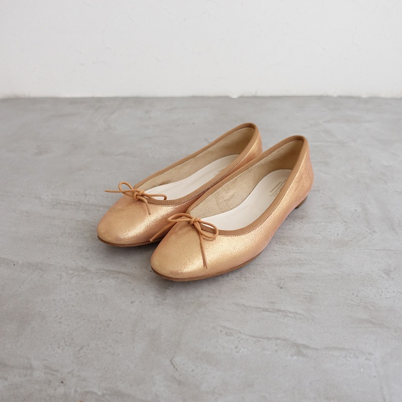 Odette e Odileのバレエシューズです。カラーはライトブラウンにゴールドラメ、素材はレザー、履き口にパイピングと甲部分にリボンがあしらわれたデザインです。