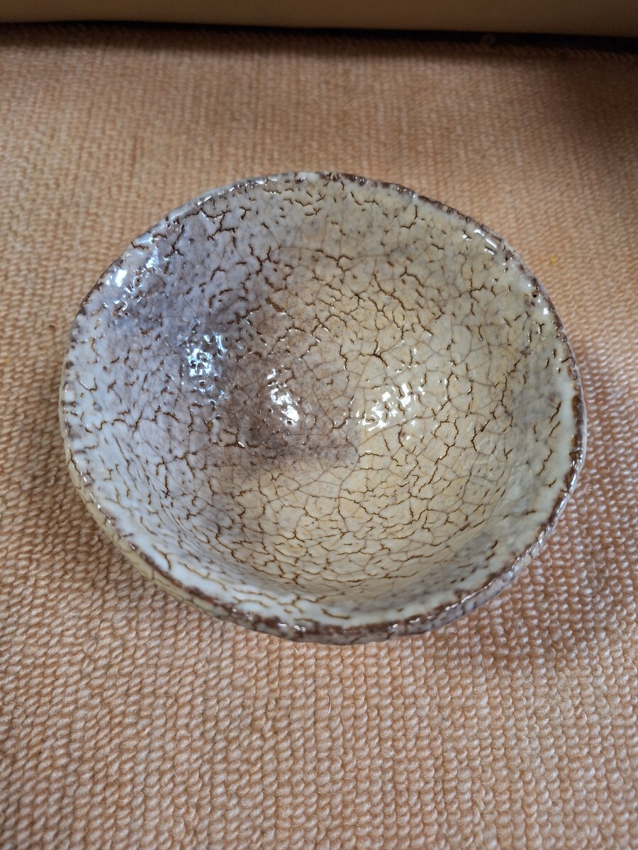 玉隆山、吉田萩苑造、梅花皮、抹茶茶碗です。口径約14cm、高さ約7、5cm、共箱入りです。