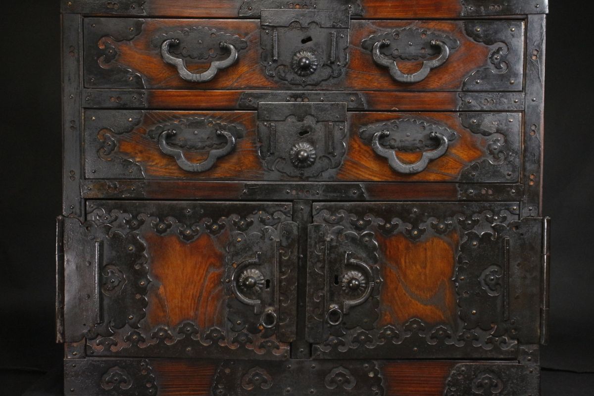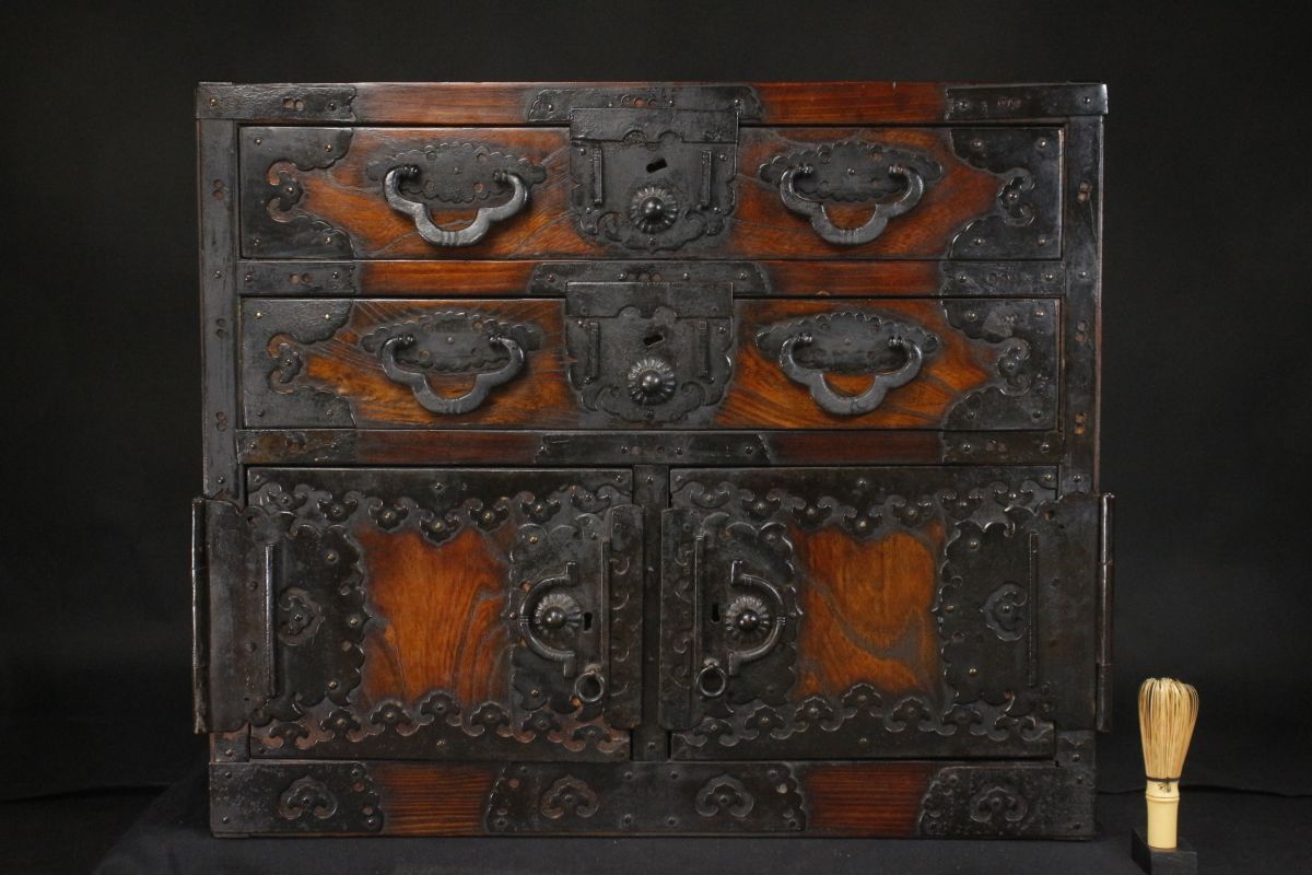 艶と深みのある木肌に重厚な鉄地金具が更なる重厚感を引きたてる船箪笥のご紹介です。